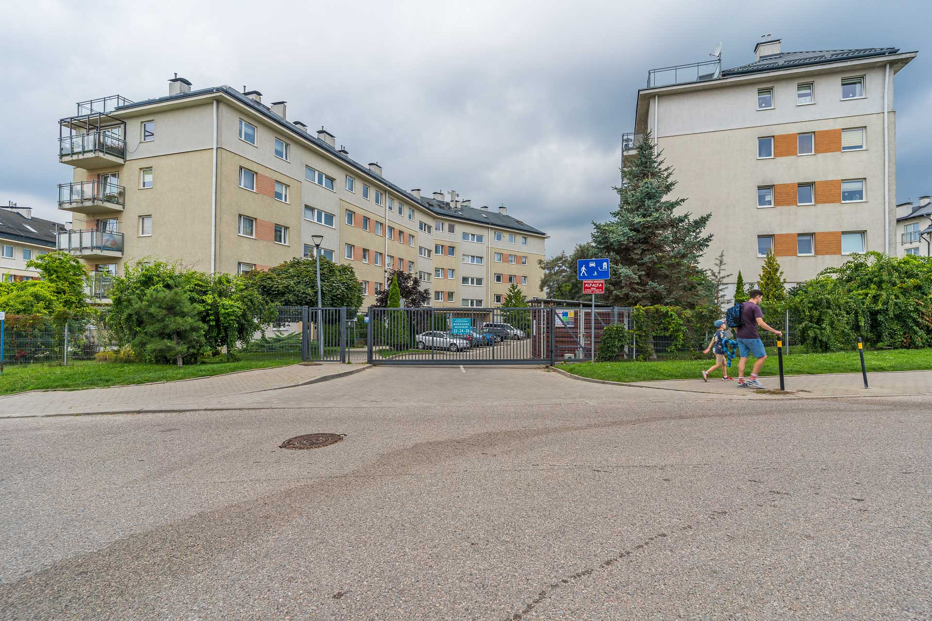 Mieszkanie mieści się na parterze 4-piętrowego bloku z 2006 roku, który wykonano przy użyciu pustaka, a jego dach pokryto blachą. Ogólny stan całej nieruchomości należy uznać za bardzo dobry. Kompleks budynków jest ogrodzony i monitorowany. Wejście do klatki schodowej zabezpieczone jest domofonem. Klatka bardzo zadbana, czysta, szeroka. Na terenie osiedla place zabaw, a w pobliżu nieruchomości znajdziemy ogólnodostępne miejsca postojowe.