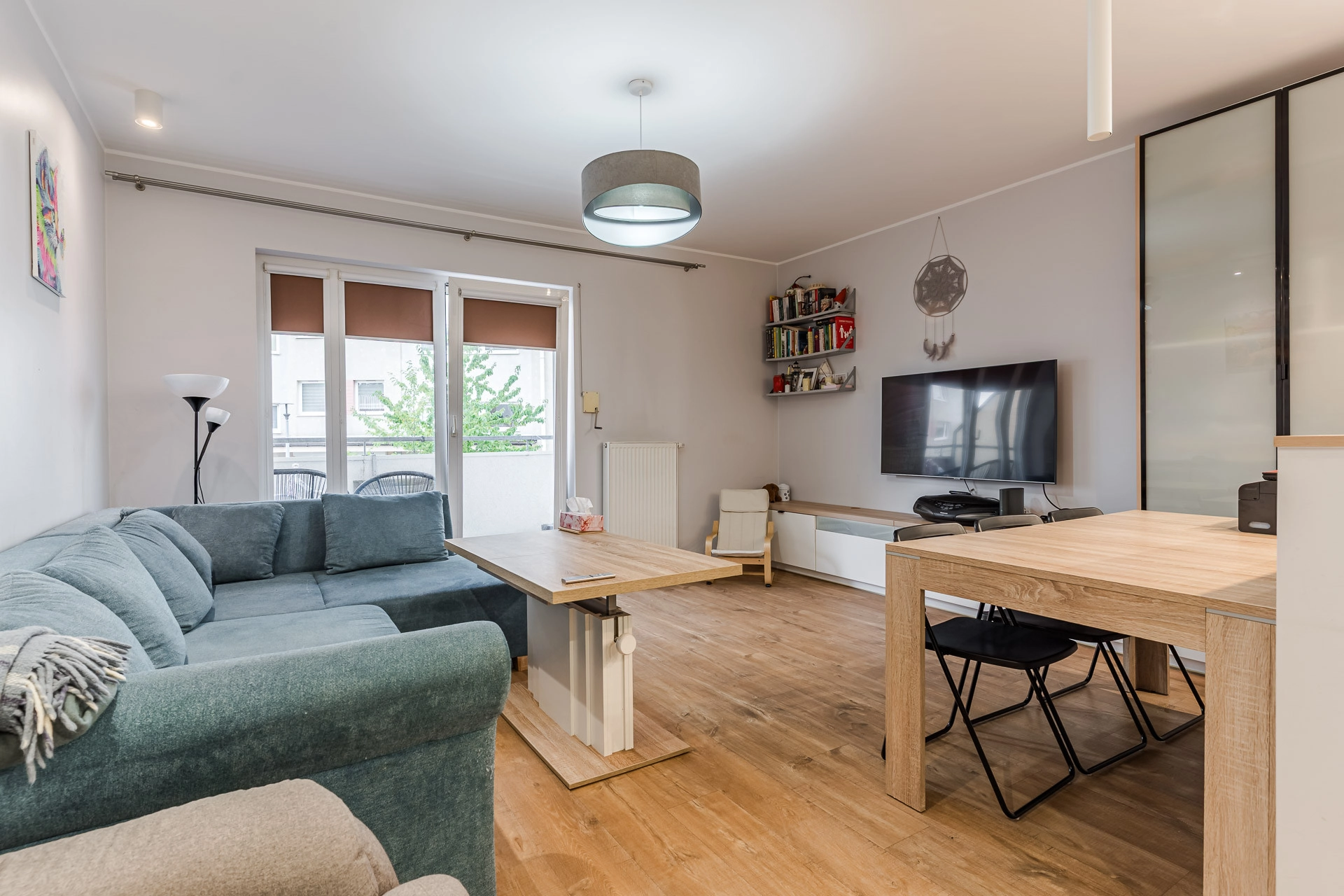 – w pełni urządzony i przestronny salon z aneksem kuchennym i sprzętem AGD. Z salonu wyjdziemy na duży balkon od strony południowej;
