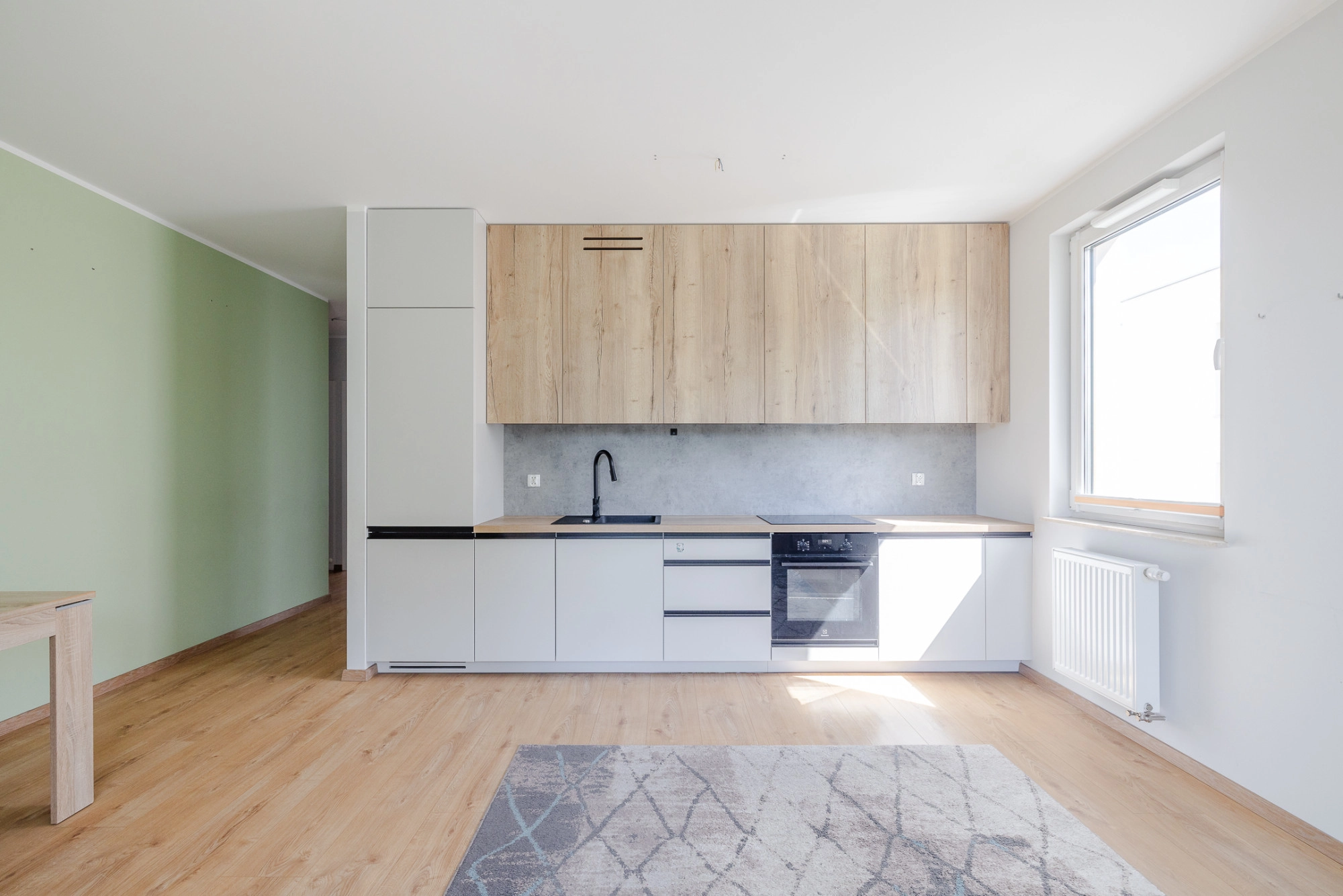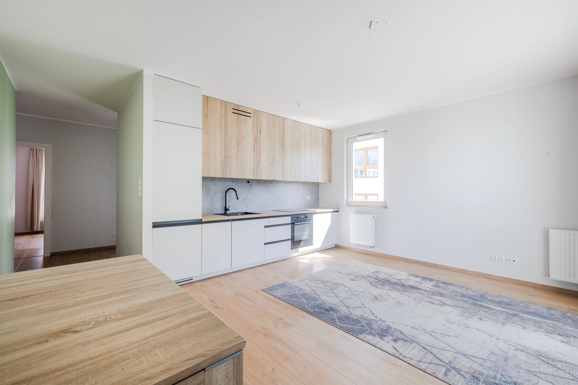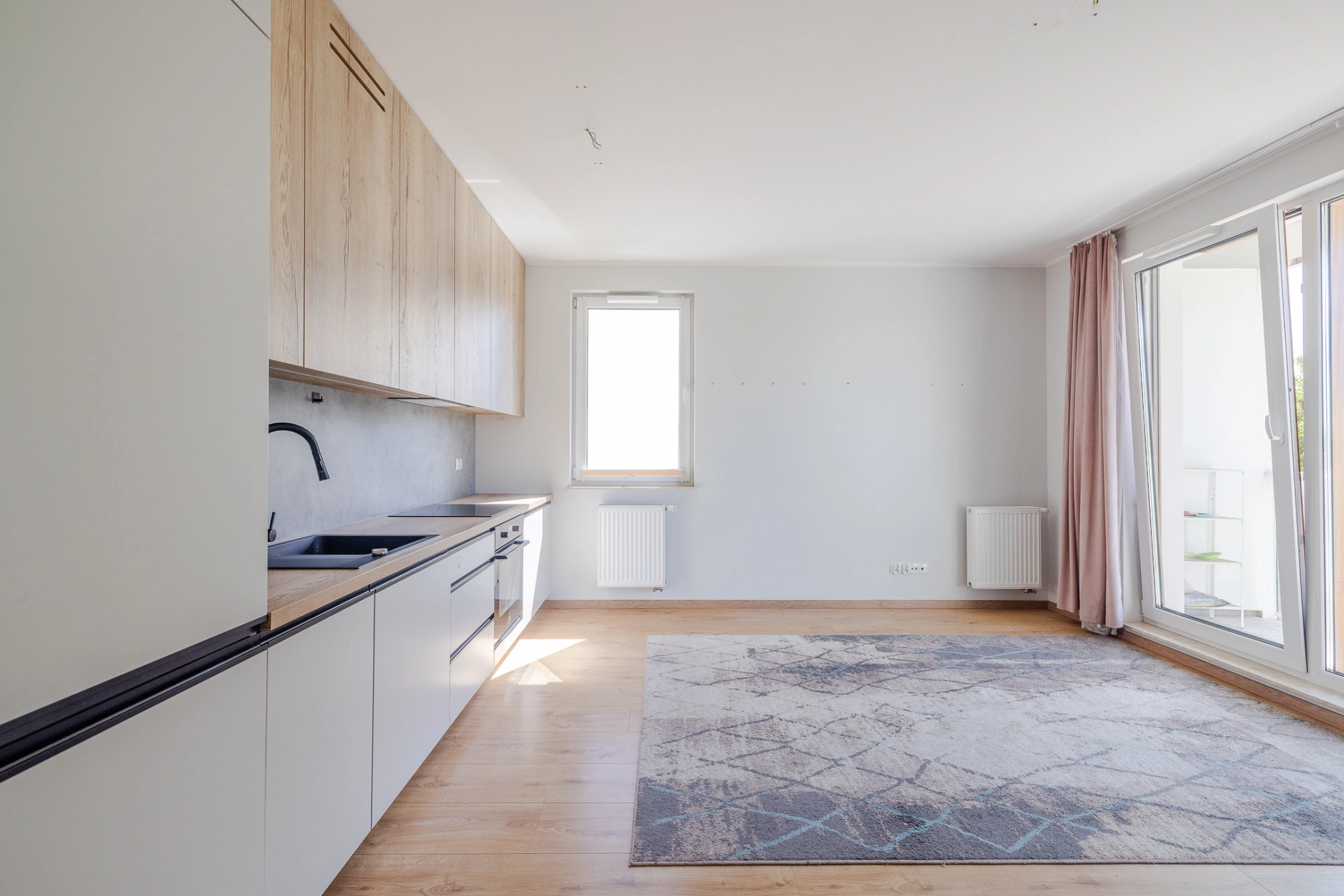 – przestronny salon z kuchnią 21,85 m2 z wyjściem na duży balkon