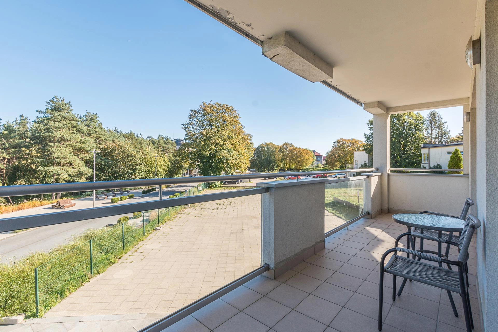 Z salonu dziennego oraz z jednej sypialni wyjście na duży taras o pow. ok. 12 m2, z drugiej sypialni wyjście na balkon o pow. ok. 6 m2.