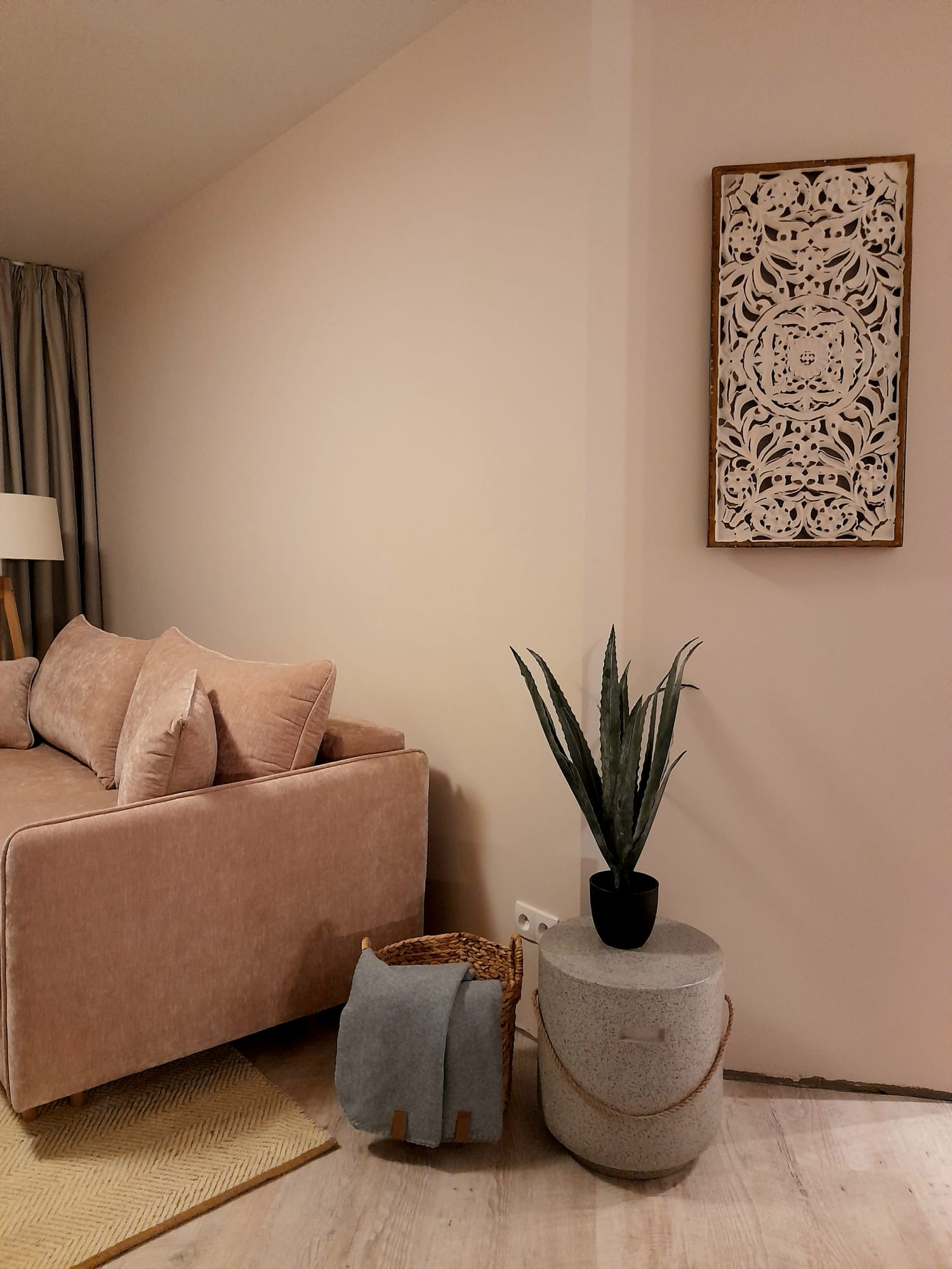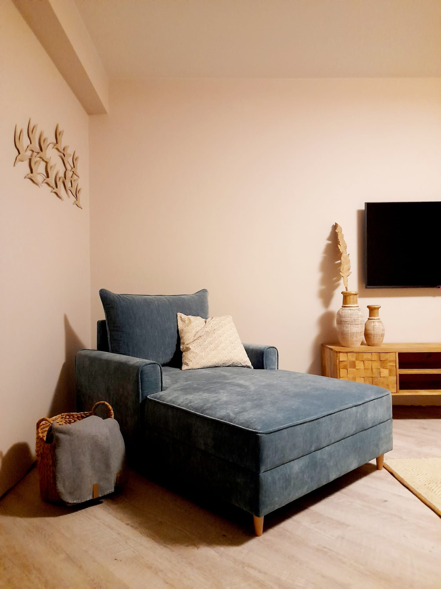 – część wypoczynkowa: telewizor, duża sofa, rozkładana kanapa, fotel i stoliki kawowe,