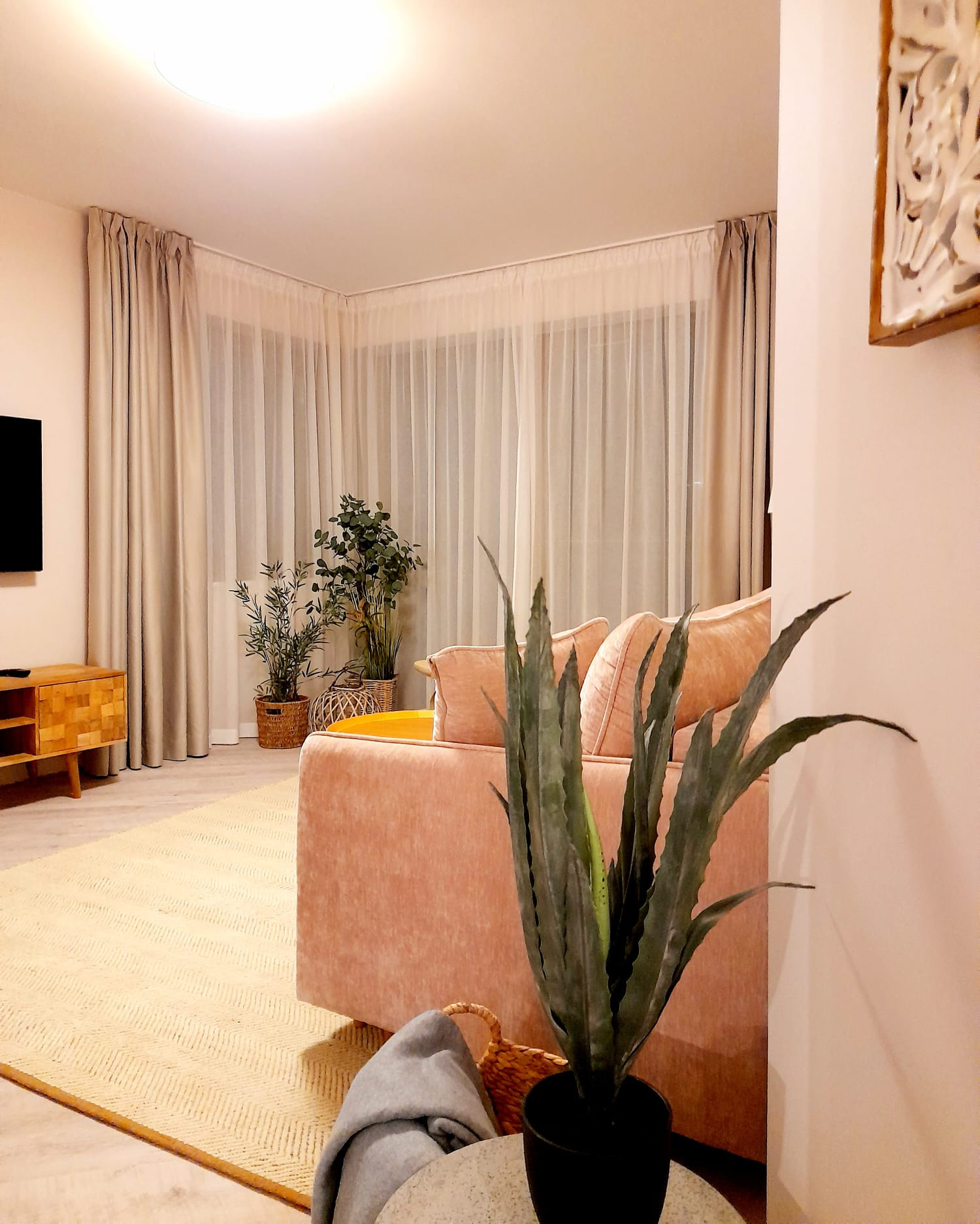 – trzech pokoi, z czego jeden największy (salon) z aneksem kuchennym, częścią jadalnianą i częścią wypoczynkową (także z funkcją sypialną), a dwa pozostałe to sypialnie,