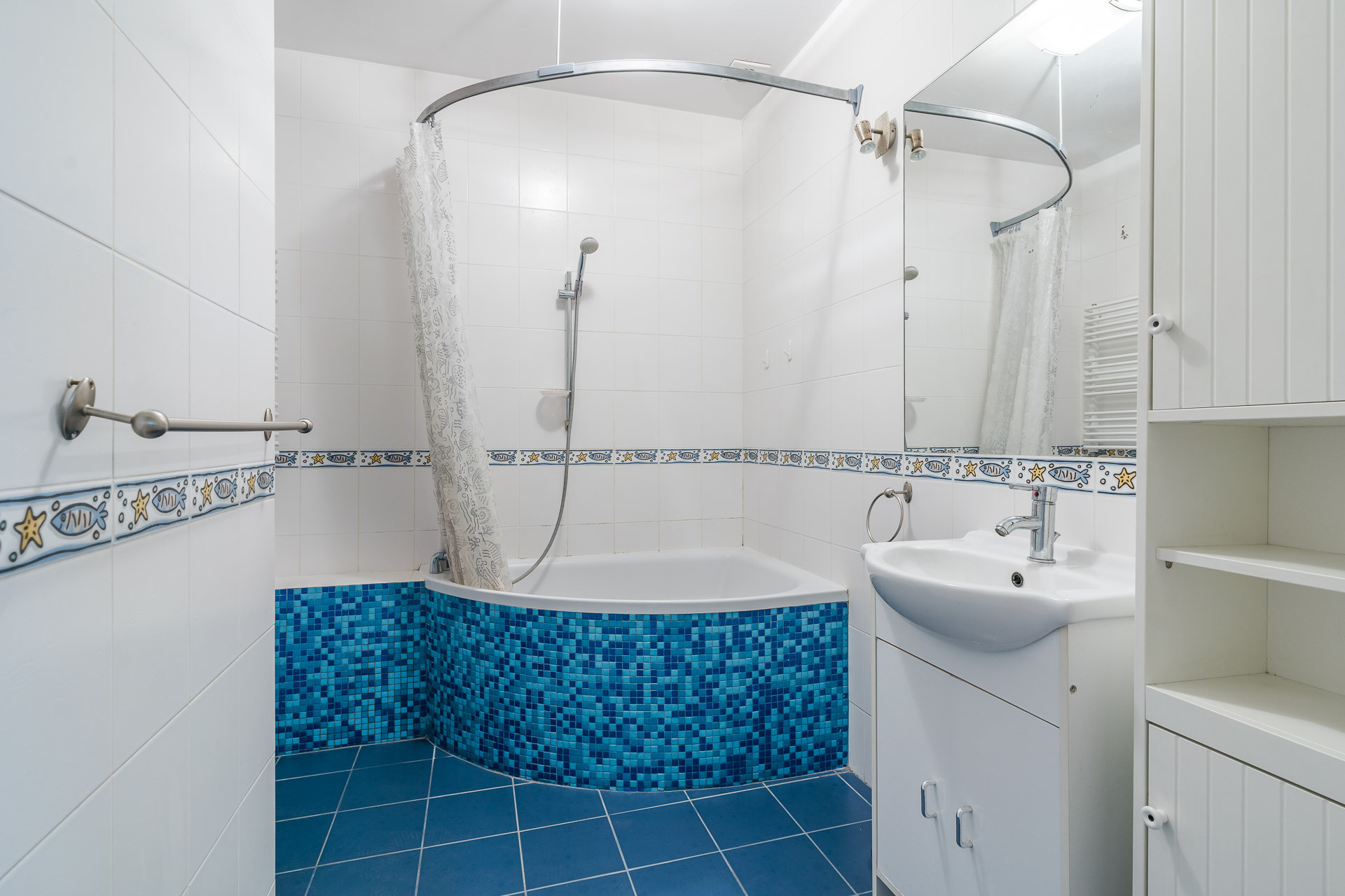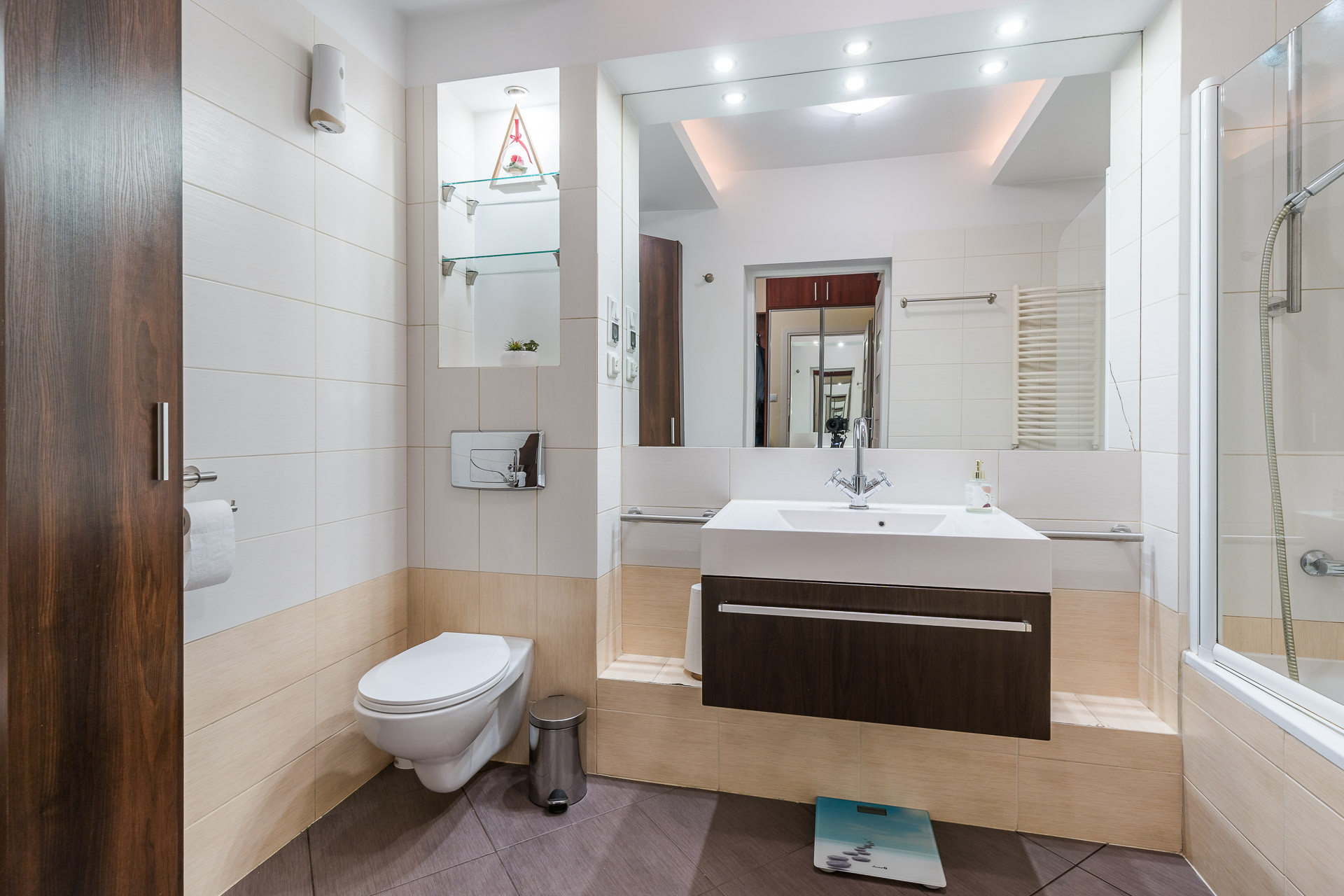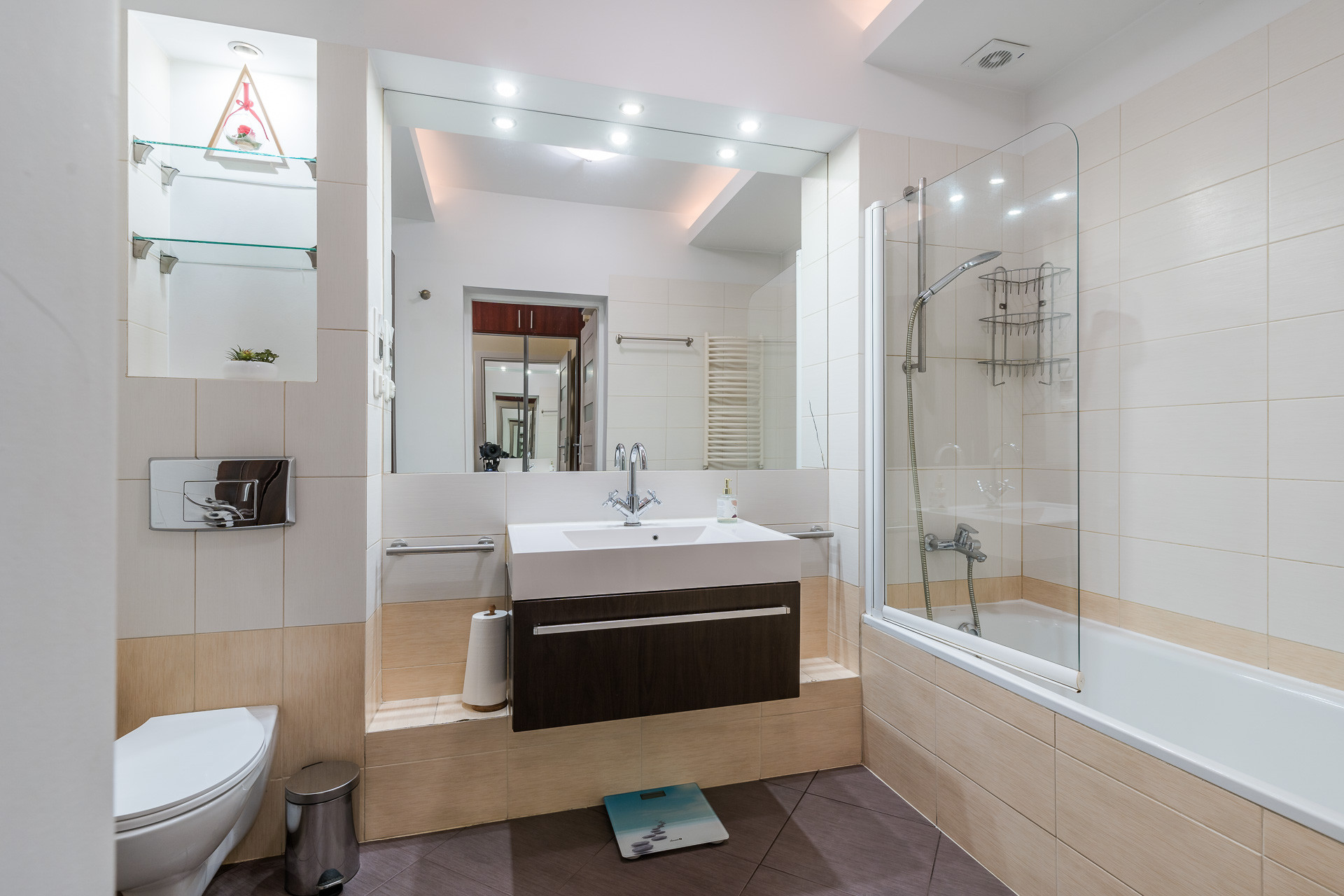– łazienka z prysznicem i wanną ( w łazience elektryczne ogrzewanie podłogowe oraz podgrzewane lustro)