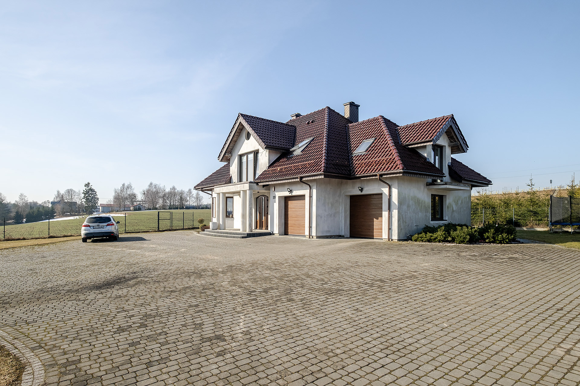 DZIAŁKA: budynek posadowiony jest na działce o nieregularnym, ale ustawnym kształcie zbliżonym do trapezu o wielkości 3497 m2. Teren jest uporządkowany, płaski, dający szerokie możliwości aranżacyjne. Posesja jest ogrodzona (stalowa siatka i elementy murowane), zadbana, aktualnie w większości pokryta trawnikiem. Podjazd domu, a także droga dojazdowa do garażu, jak i chodnik prowadzący do drzwi wejściowych wyłożone są kostką brukową. Na posesji znajdziemy także wolnostojący budynek pełniący funkcję warsztatu/pracowni/domku ogrodowego do przechowywania różnych sprzętów.