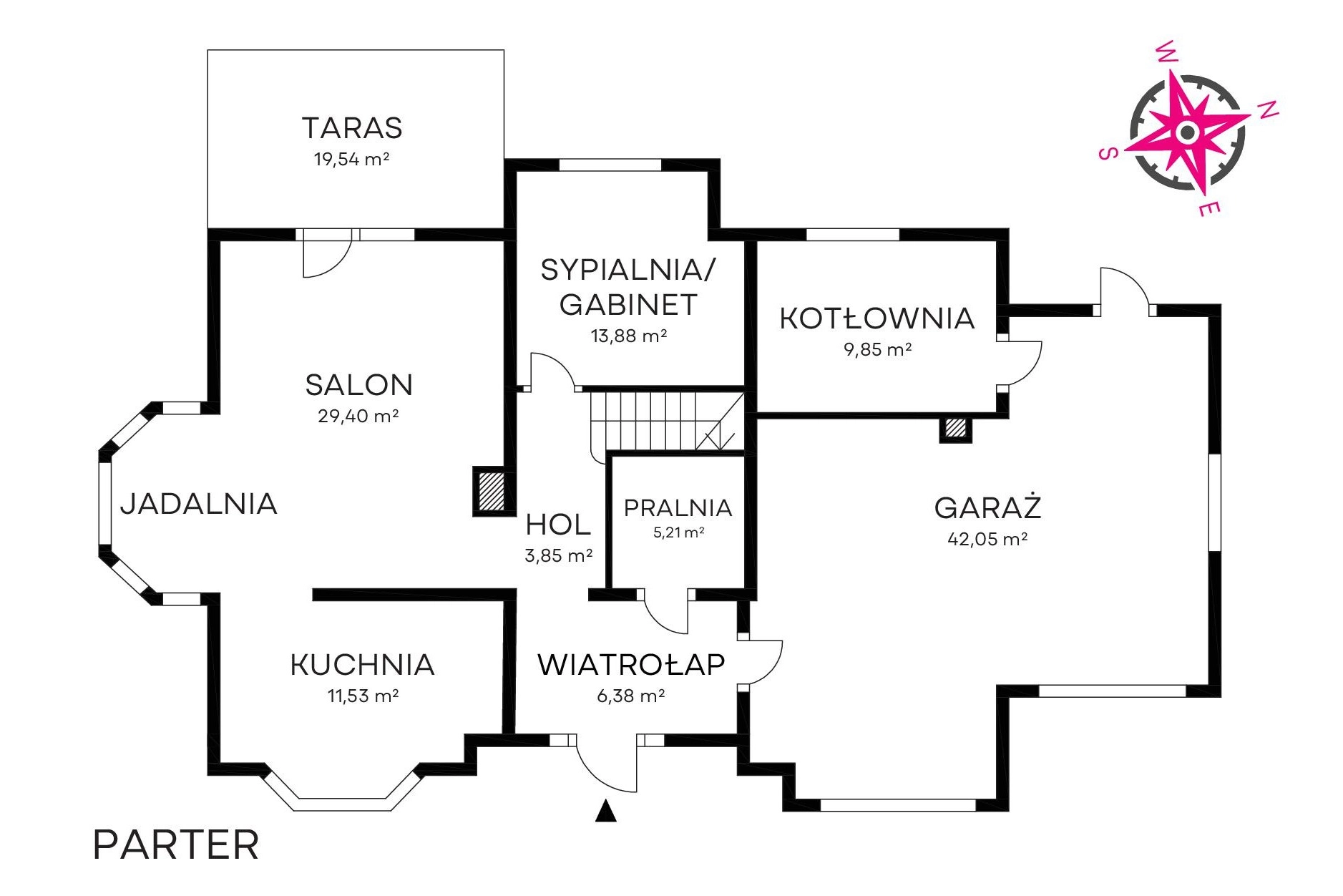 – salon z jadalnią (29,40 m2) z wyjściem na taras (19,54 m2) i ogród,