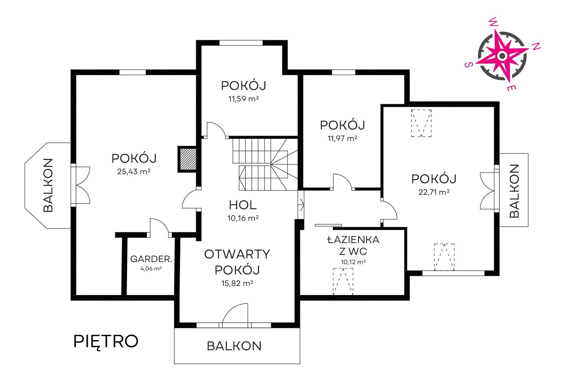 – 4 pokoje zamykane (25,43 m2; 22,71 m2; 11,97 m2 oraz 11,59 m2); z dwóch największych wyjście na balkon, a w największym dodatkowo garderoba (4,06 m2),