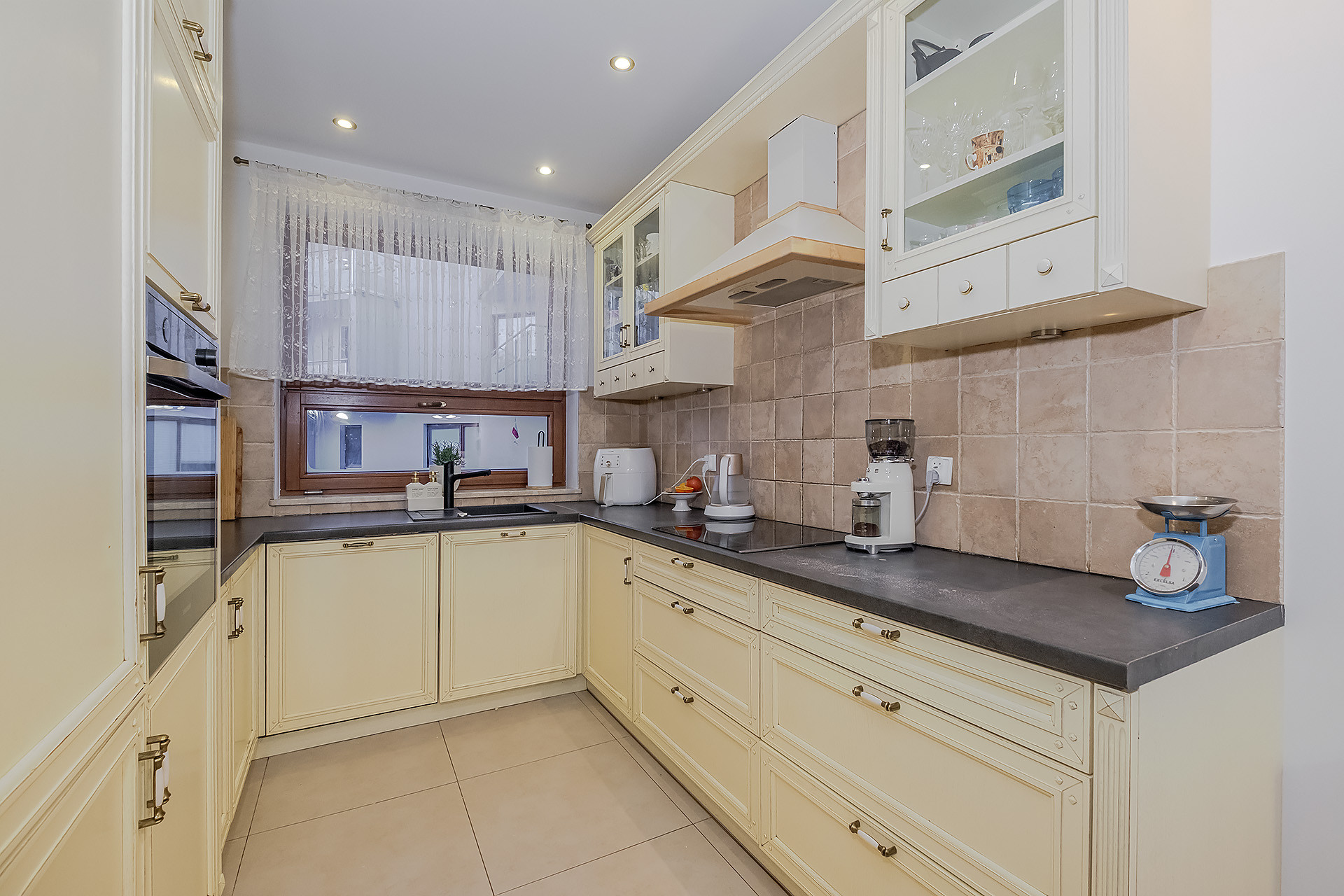 Na podłodze deska, w łazience, pomieszczeniu gospodarczym/garderobie oraz w kuchni kafle. Kuchnia w pełni wyposażona w sprzęty AGD.