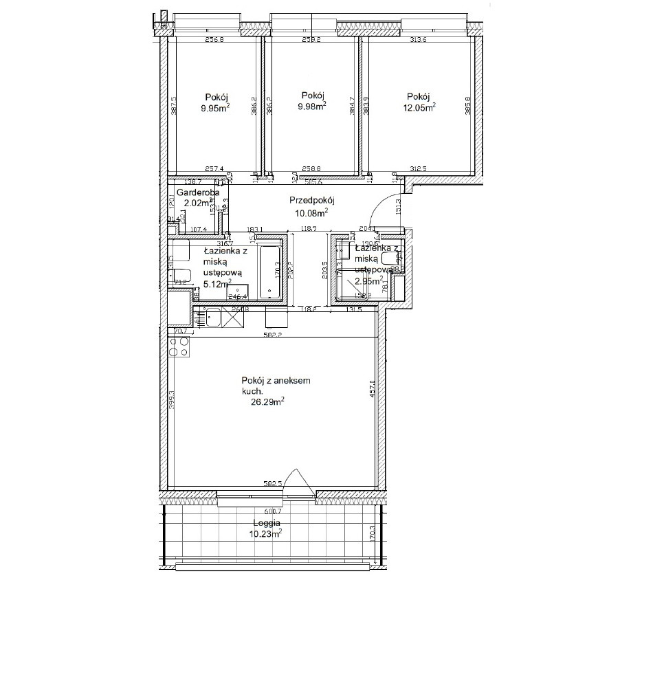 – Salon z aneksem kuchennym 26,29m2 z wyjściem na dużą loggię 10,23m2