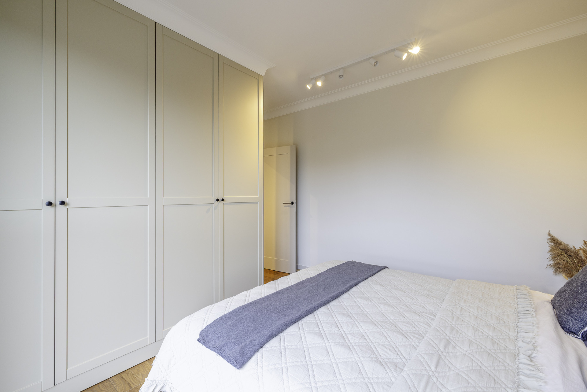 Sypialnia 14 m2 – szafa garderobiana, tapicerowane łózko ze skrzynią, stoliki nocne, lampy