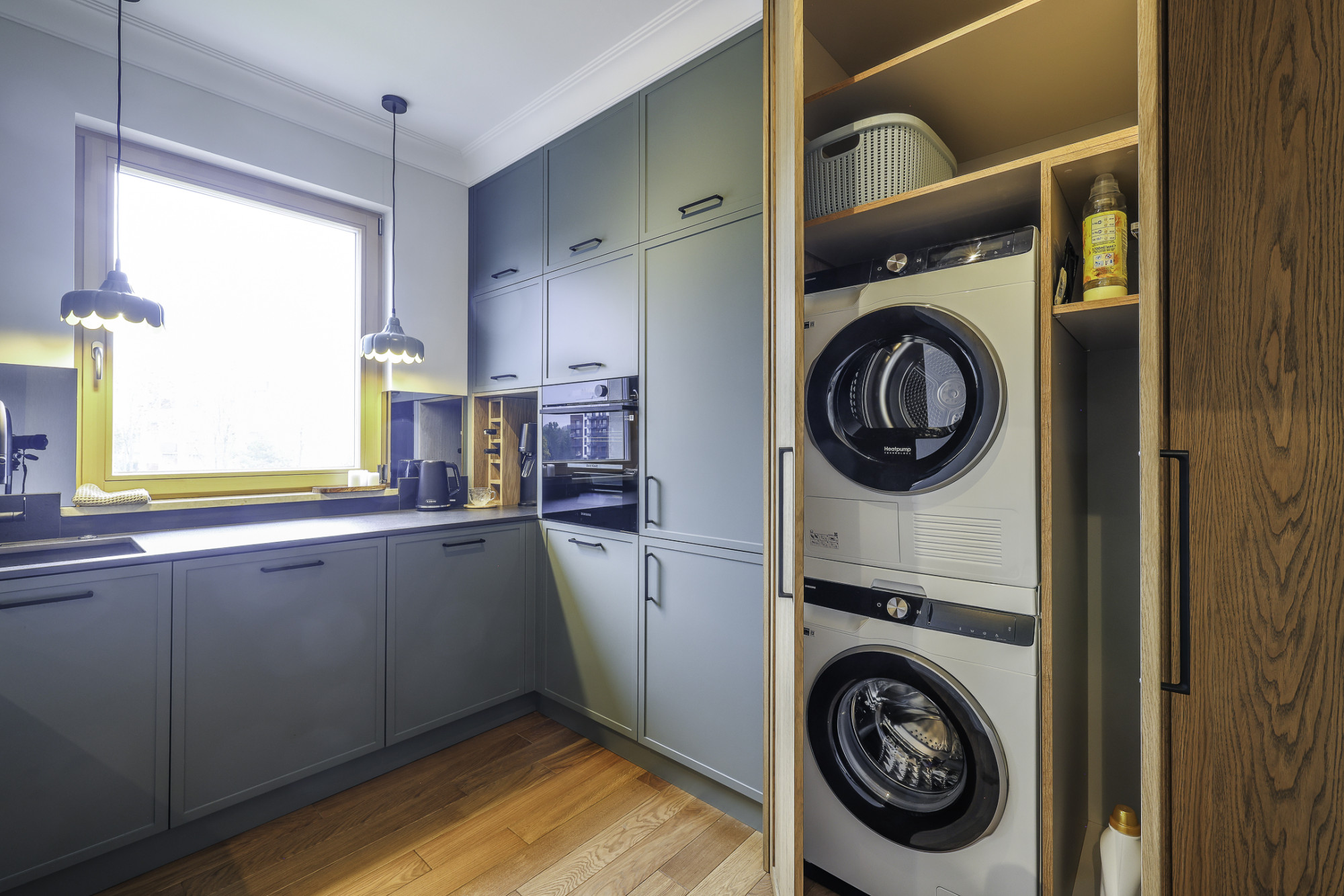 Holl – szafa ubraniowo – gospodarcza z pralką i suszarką Samsung, odkurzacz JET