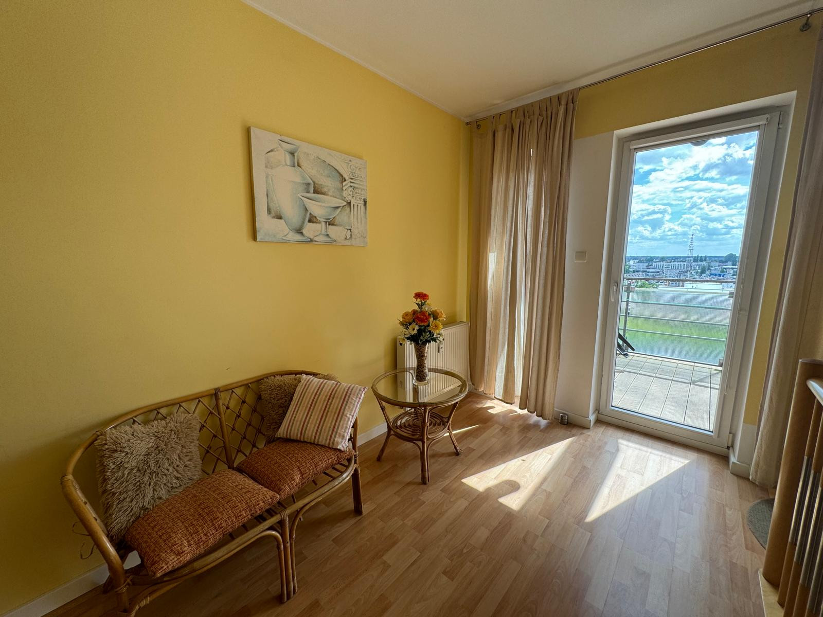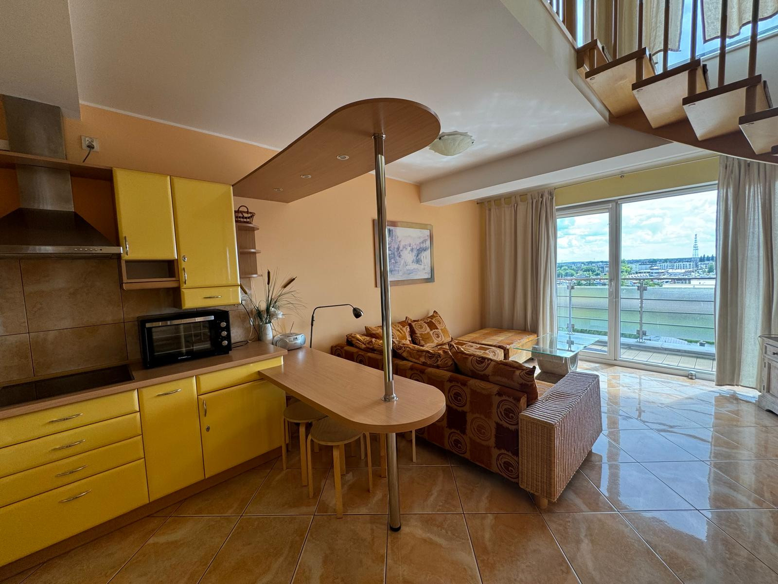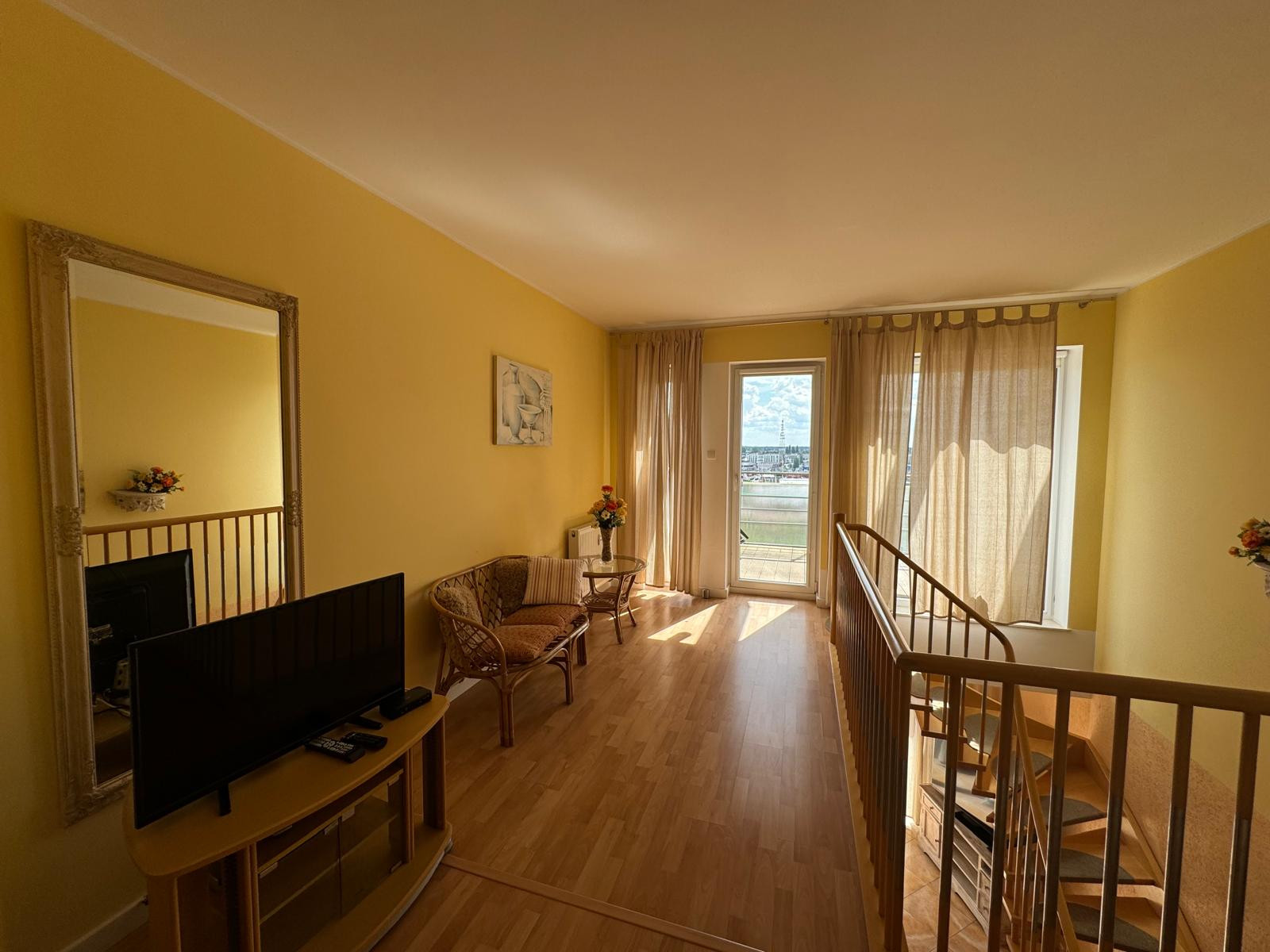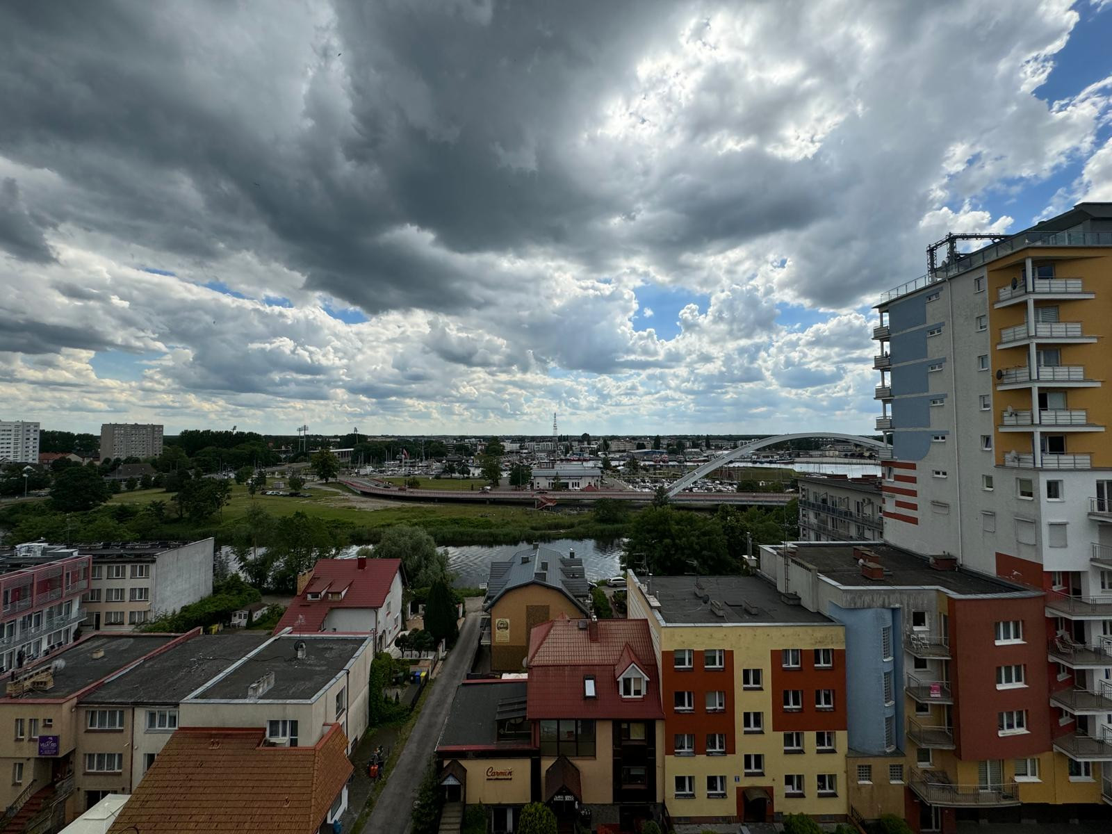– sypialnia z częścią dzienną o pow. ok. 28 m2 (z wyjściem na duży taras od południowego zachodu – widok na rzekę Parsętę, Port Jachtowy i panoramę miasta).