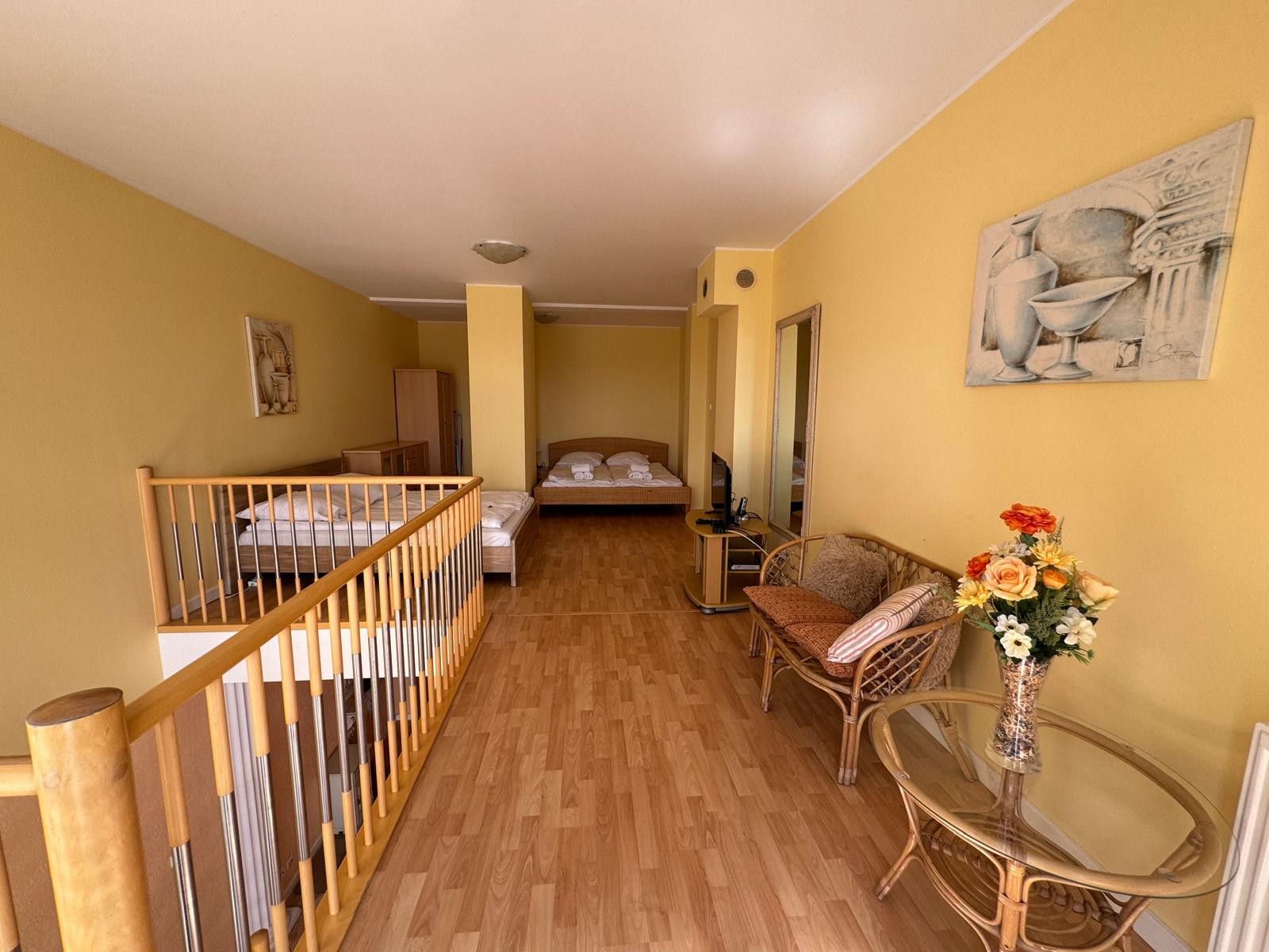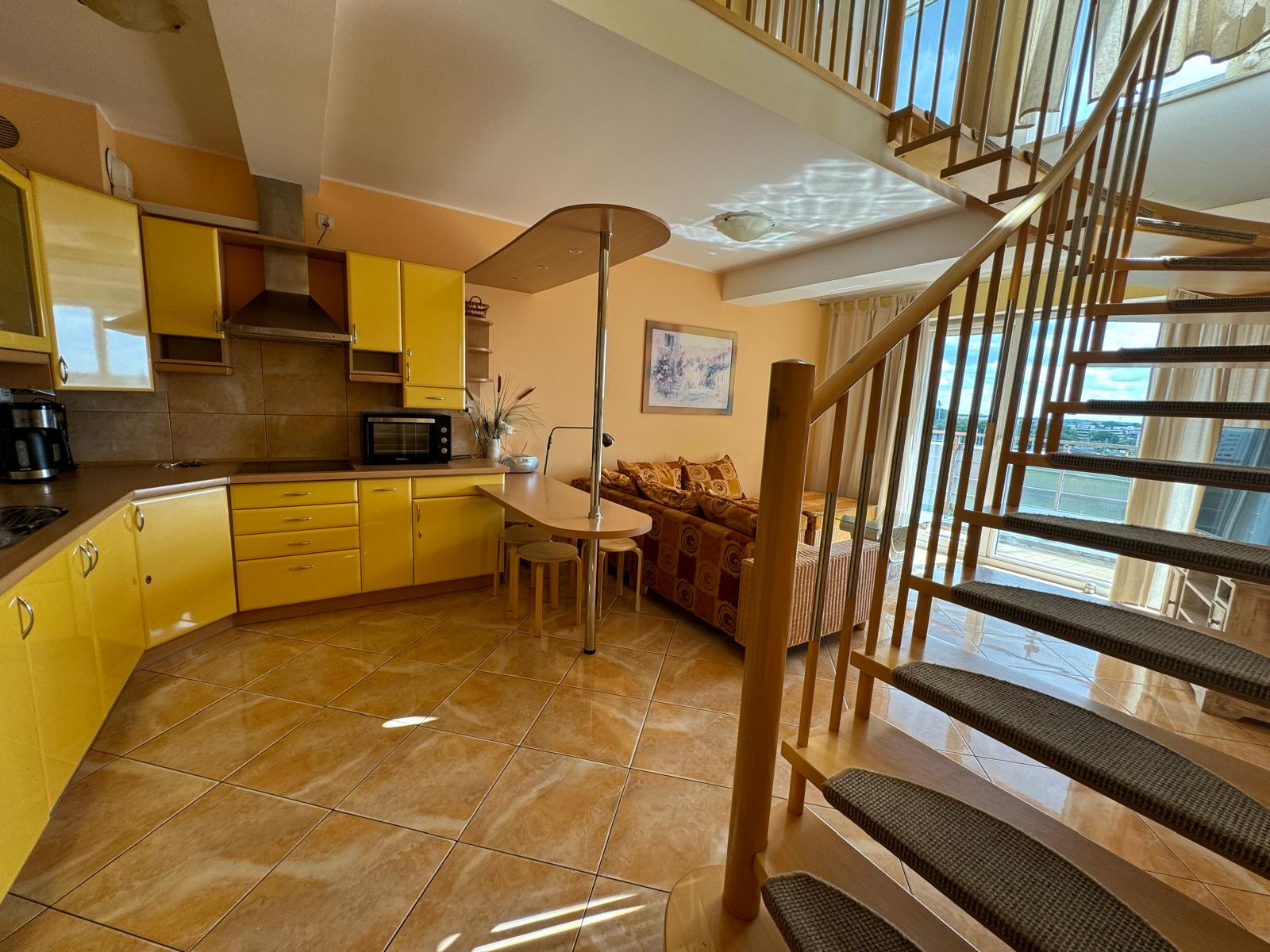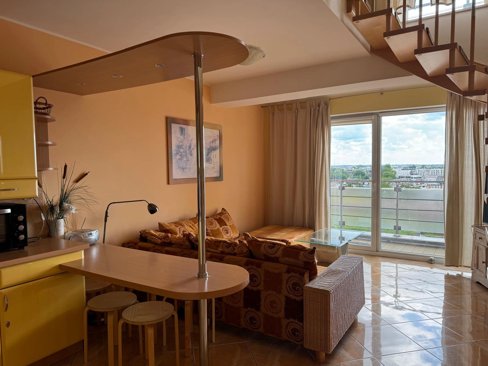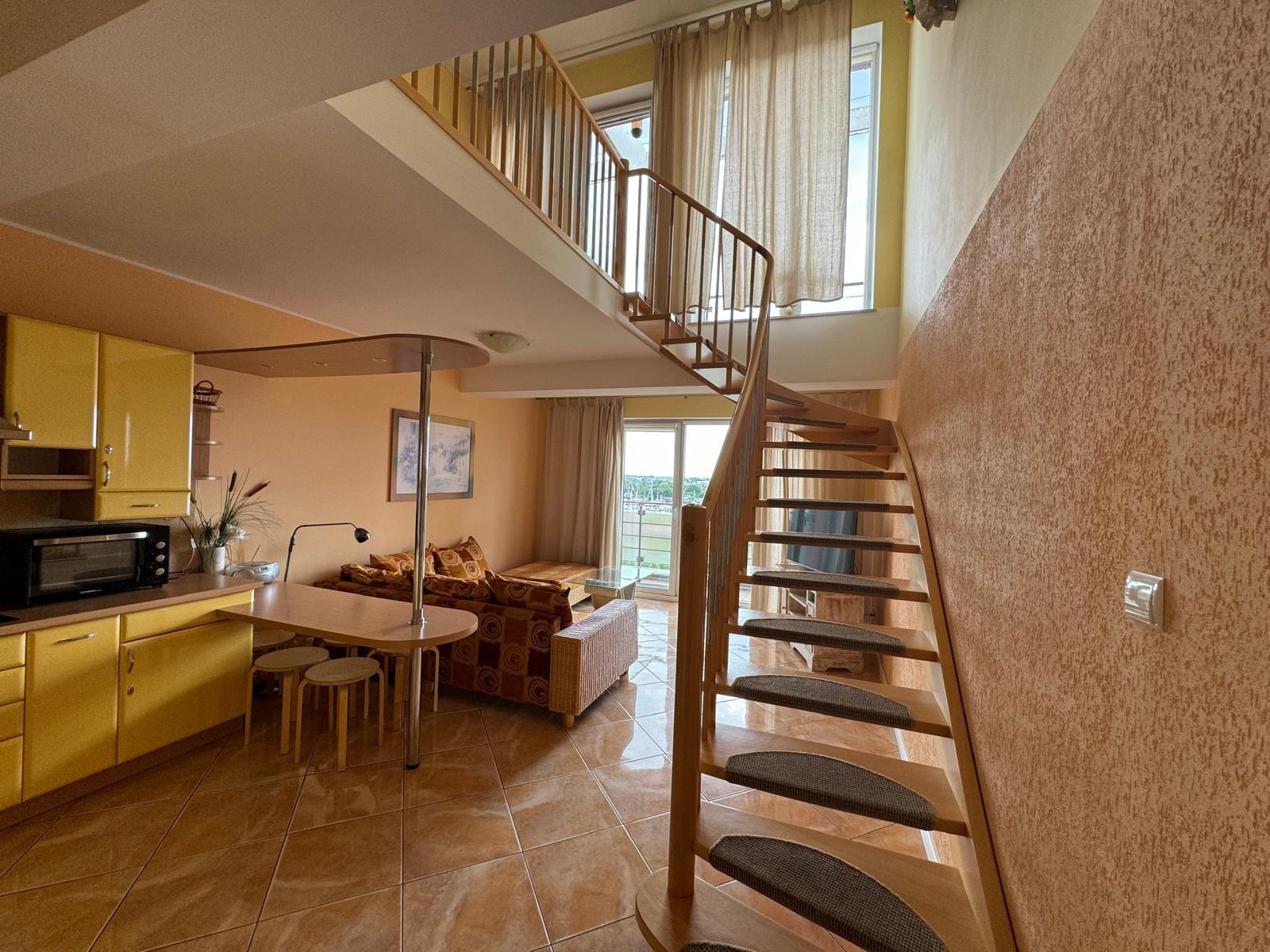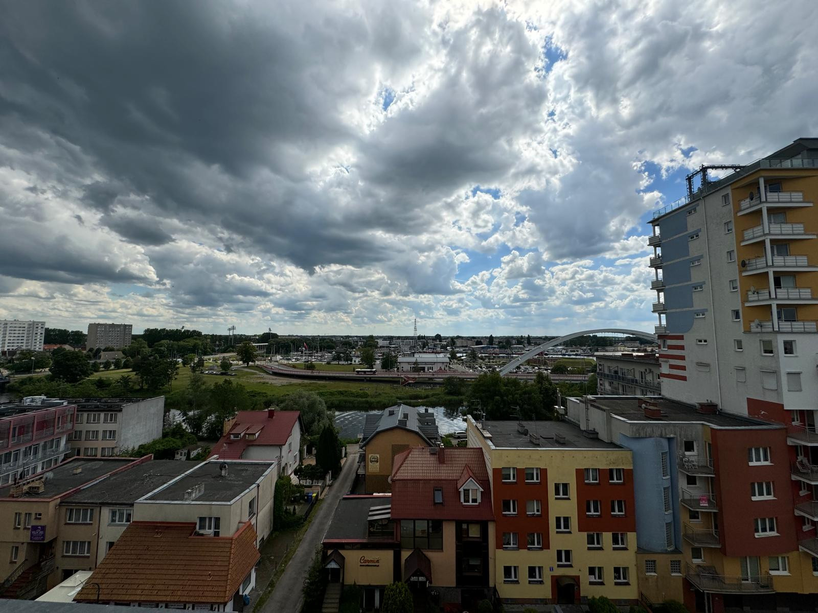 – sypialnia z częścią dzienną o pow. ok. 28 m2 (z wyjściem na duży taras od południowego zachodu – widok na rzekę Parsętę, Port Jachtowy i panoramę miasta).