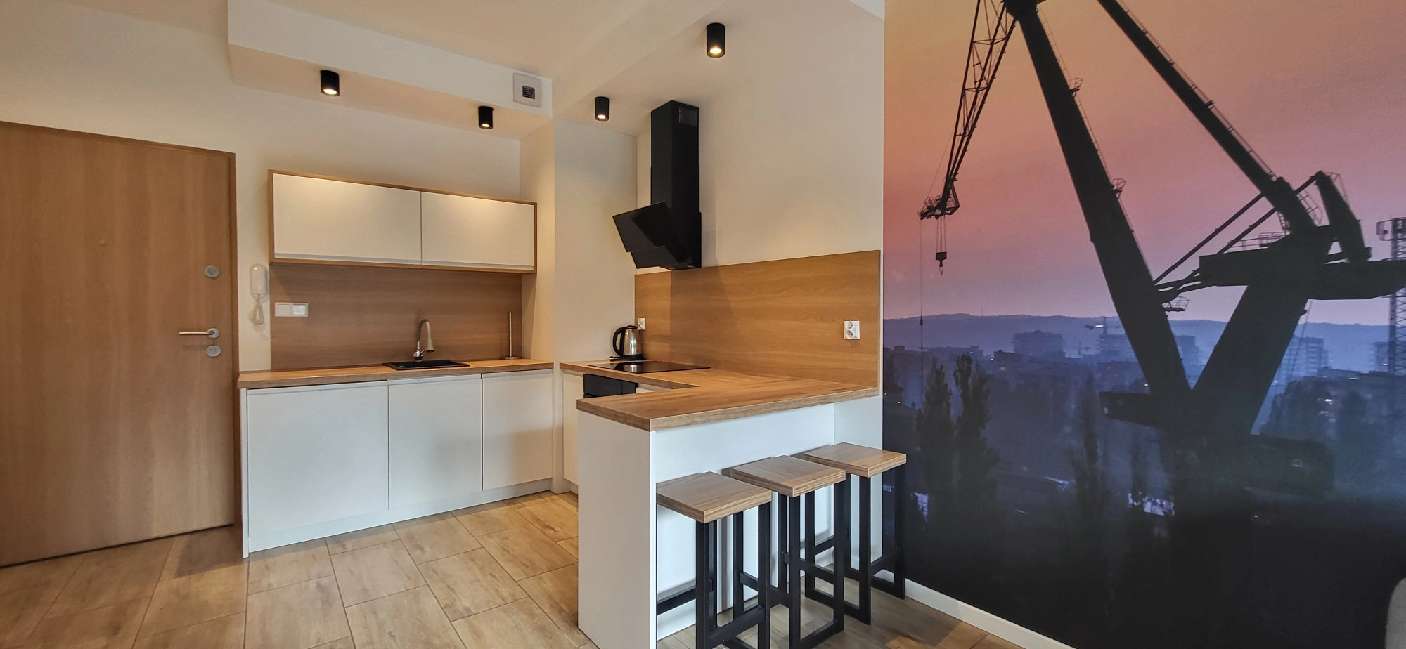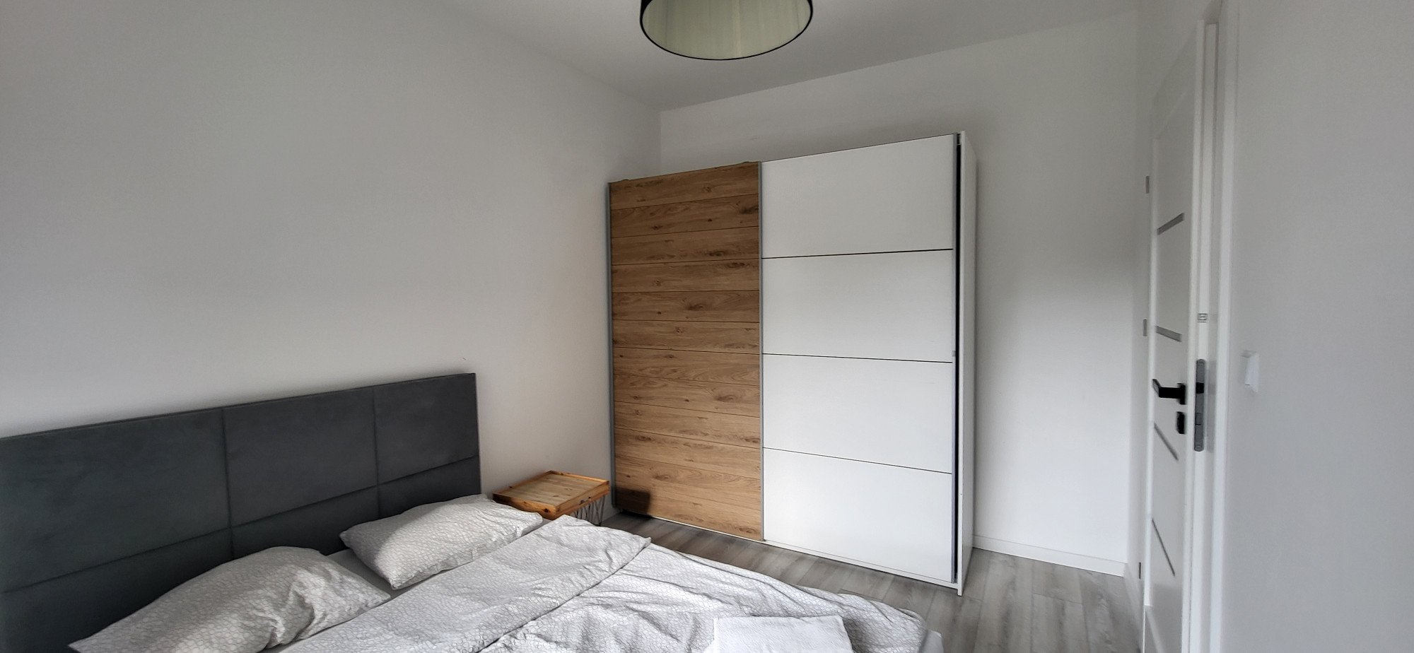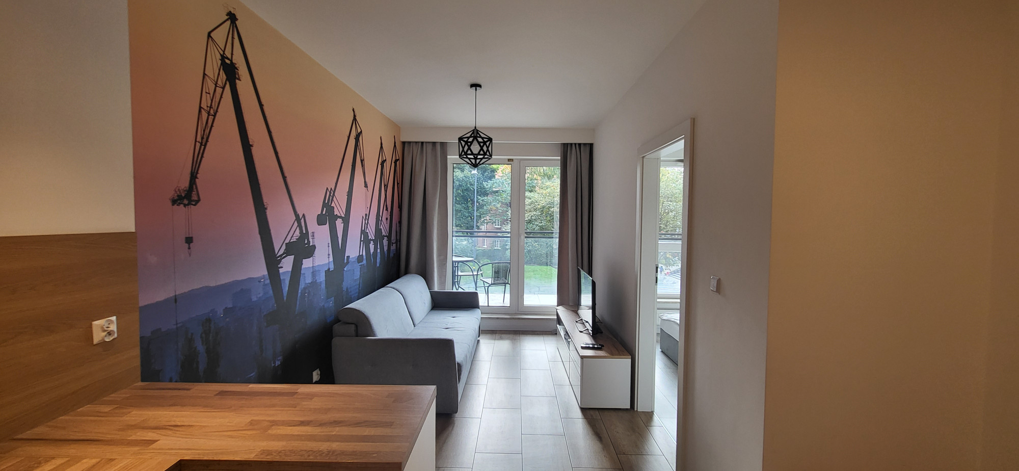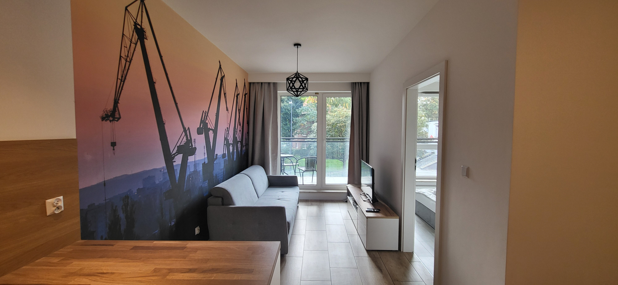 Apartament składa się z salonu z aneksem kuchennym z wyjściem na balkon, sypialni oraz łazienki z prysznicem.