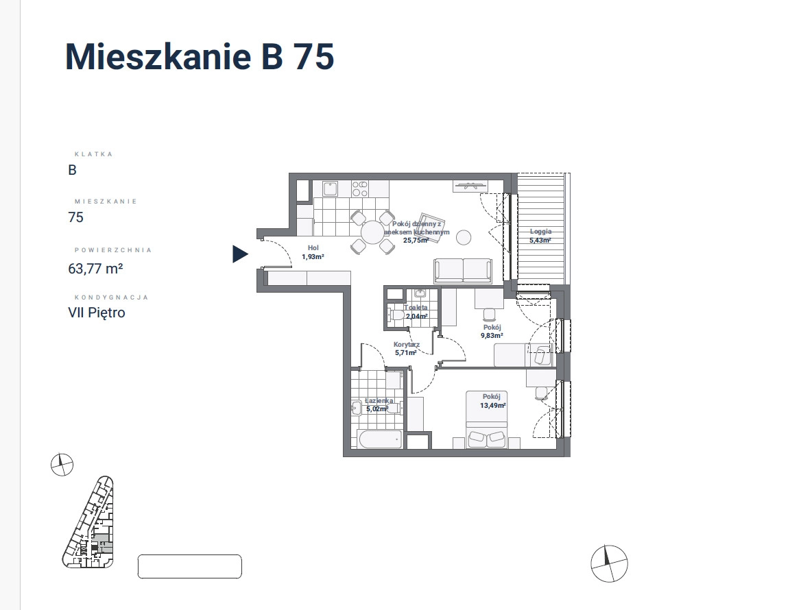 Mieszkanie znajduje się na 7 piętrze, a jego powierzchnia wynosi 63,77m2. W jego skład wchodzą: