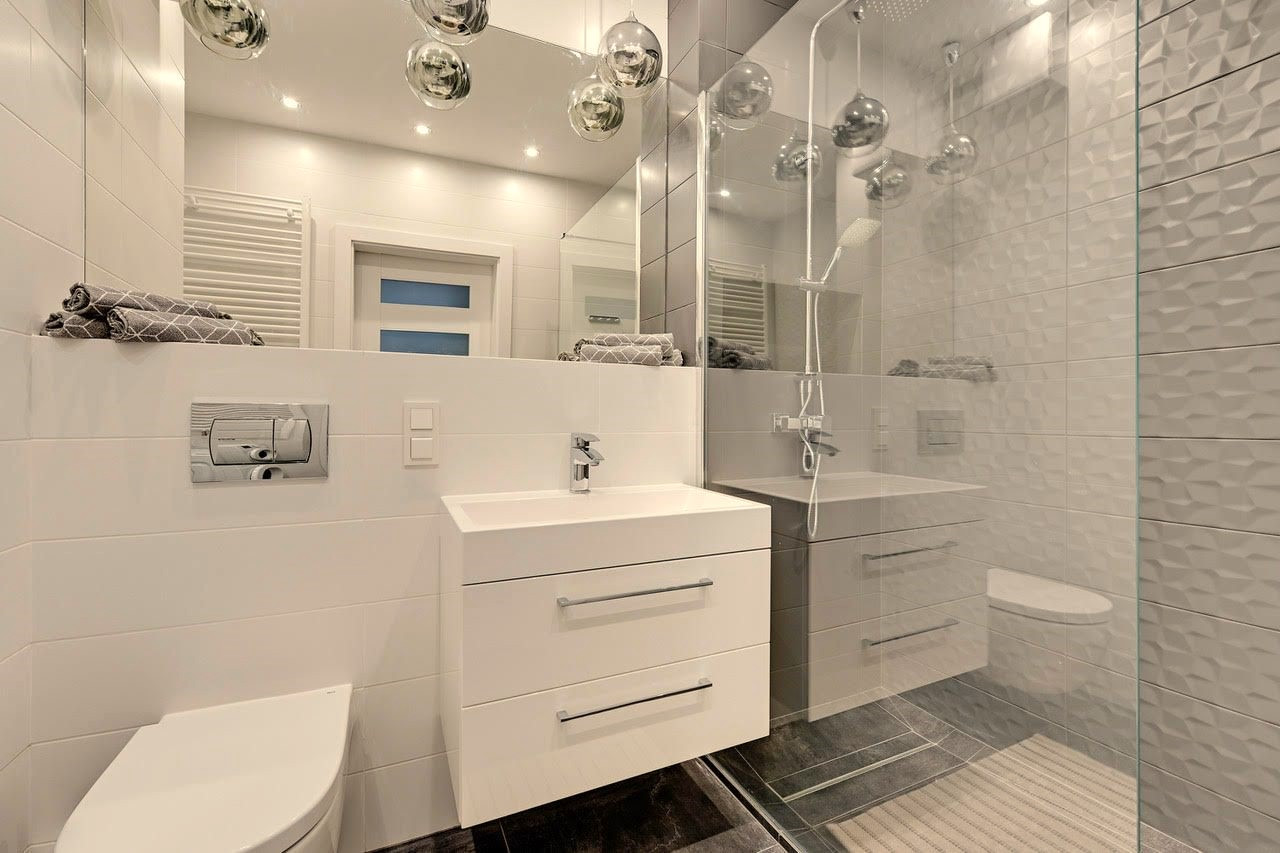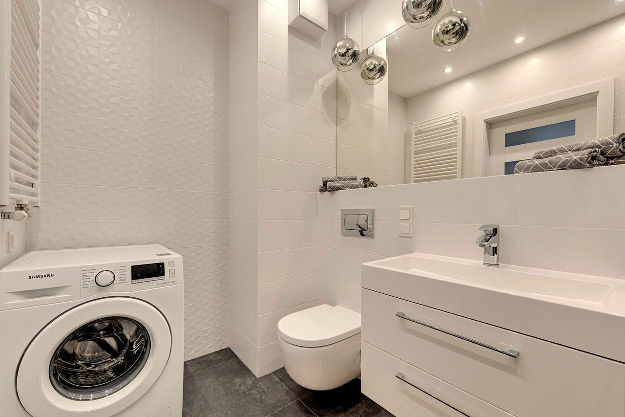 łazienka z WC i prysznicem, wyposażona w pralkę,