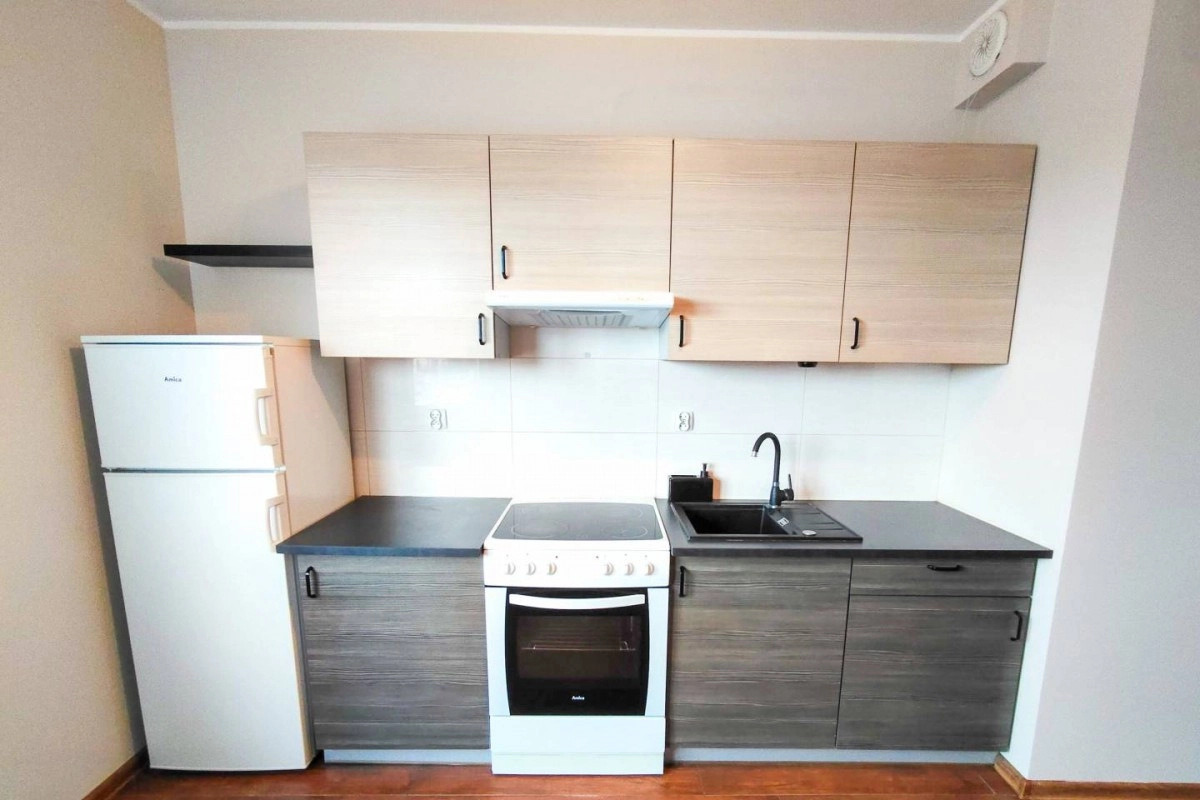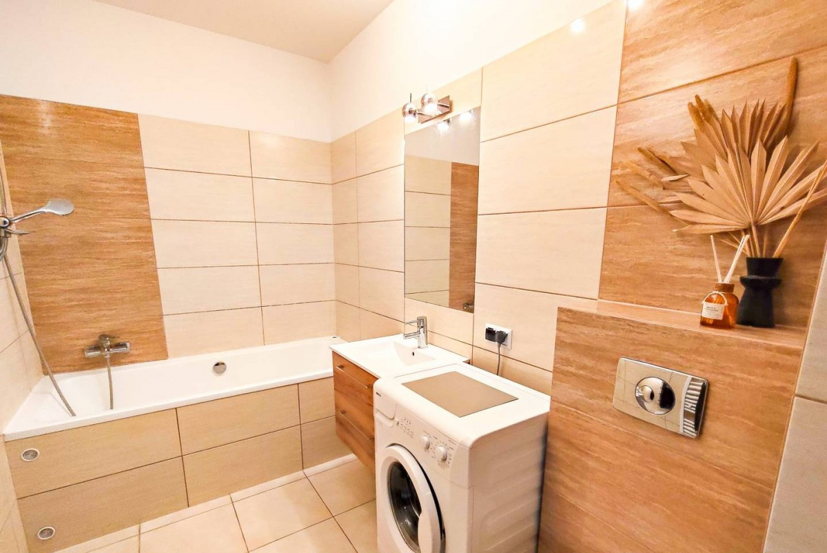 Mieszkanie jest wyposażone w niezbędne sprzęty RTV/AGD (lodówka, pralka, piekarnik, płyta indukcyjna, zmywarka). Jasne wnętrza i funkcjonalny układ zapewniają komfort codziennego użytkowania.