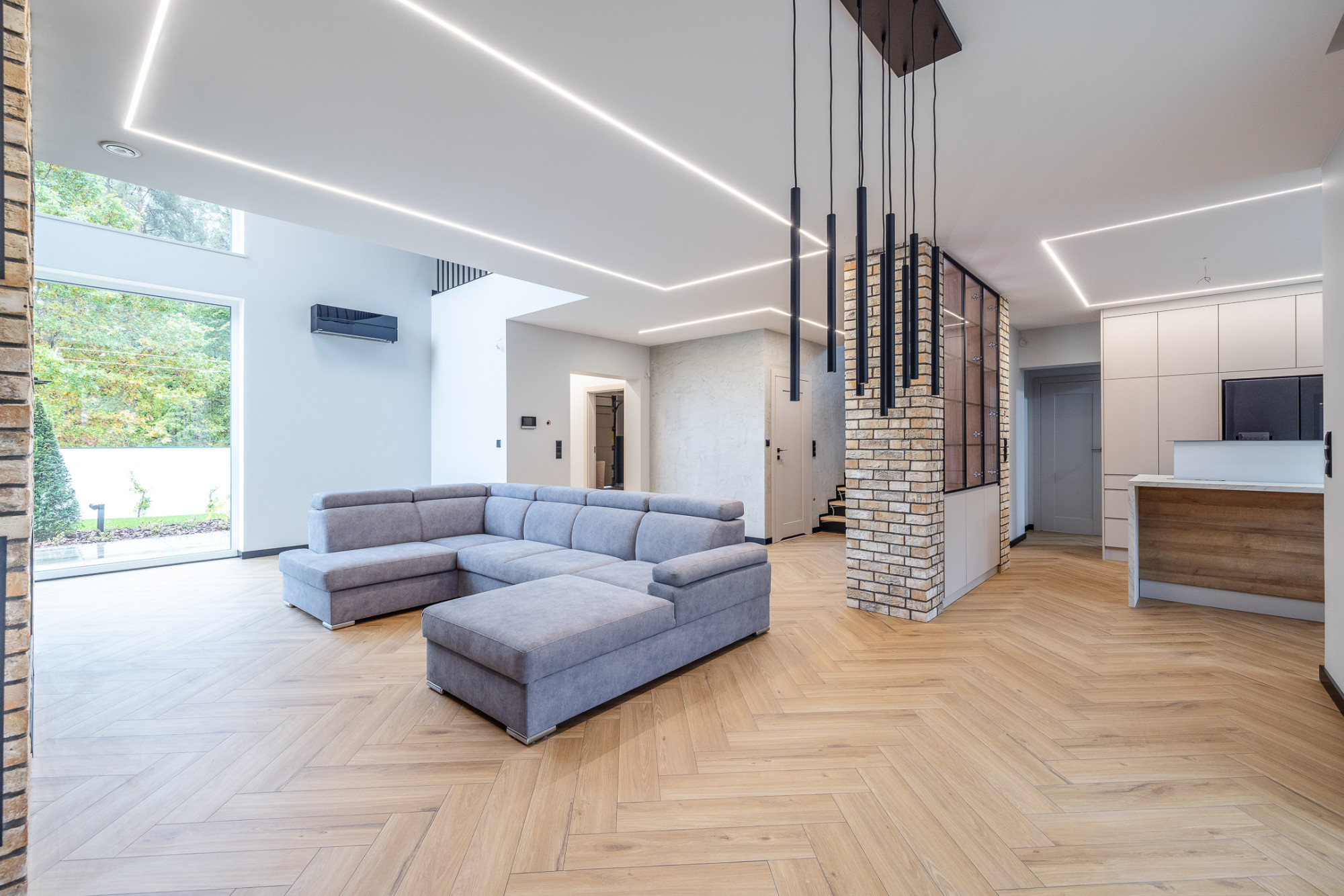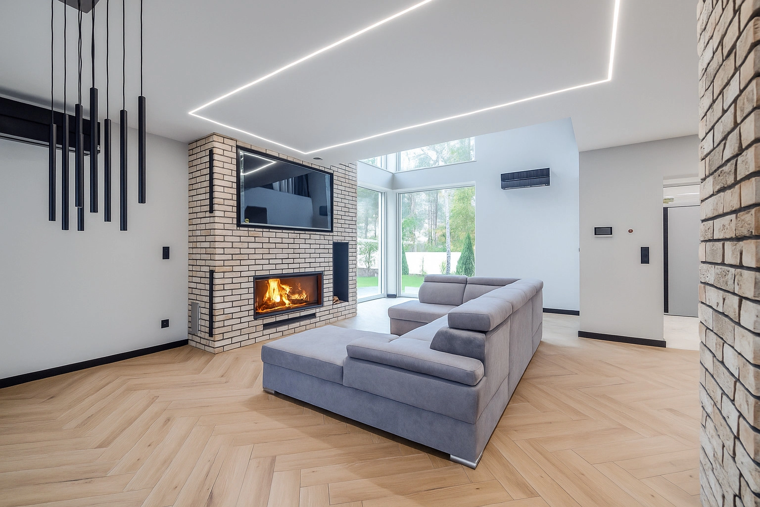 Na poziomie pierwszym do dyspozycji domowników mamy pokój dzienny o powierzchni 38,86m2 z wysokim sufitem – 5,70 m i kominkiem, z dwoma klimatyzatorami (Klasa efektywności energetycznej do A+++, Bardzo cicha praca — tylko 19 dB(A) z funkcją Czujnika 3D i-see wykrywającą obecność i położenie osób w pomieszczeniu, a następnie odpowiednio dopasowuje tryb pracy klimatyzacji. Dzięki temu jednostka ścienna Diamond nie tylko oszczędza energię, ale pozwala również zwiększyć komfort poprzez odpowiednie sterowanie kierunkiem nawiewu powietrza,