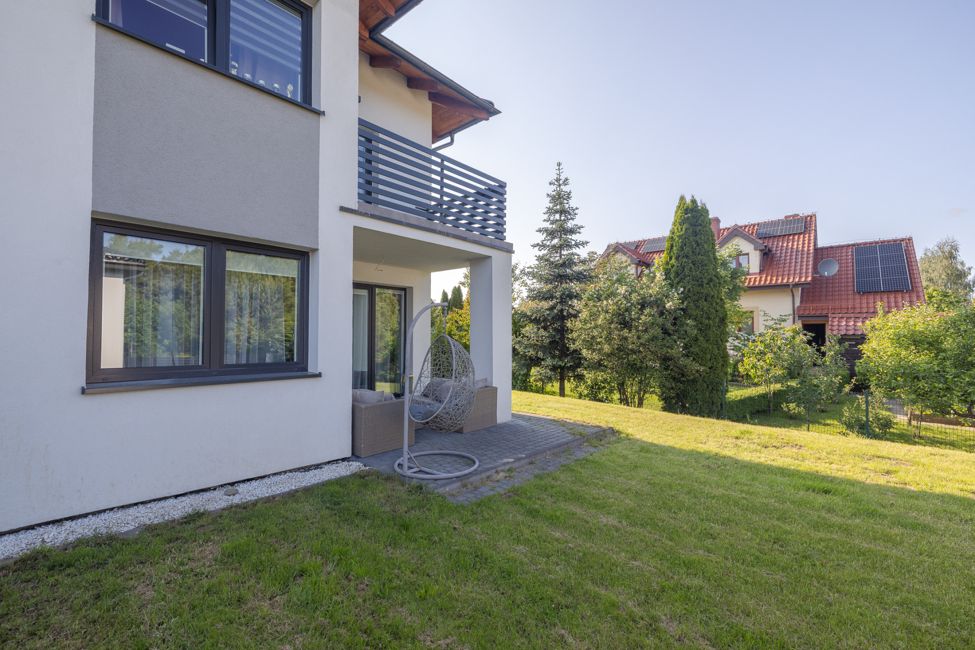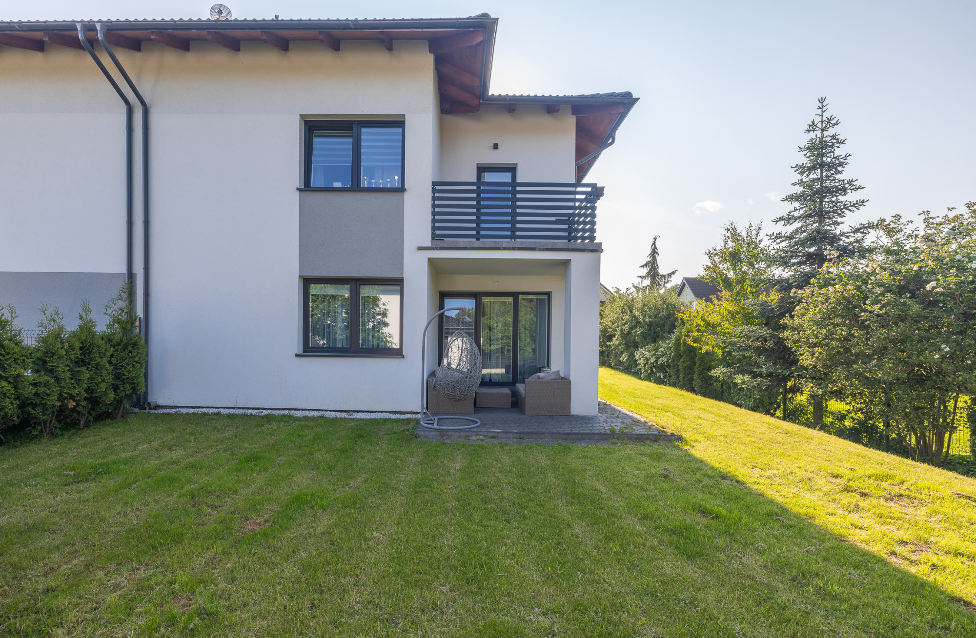 Przestronny, nowoczesny dom w zabudowie bliźniaczej o powierzchni użytkowej 167,10 m2 na dwóch piętrach, bez skosów. Dodatkowo ogromna przestrzeń do zaadoptowania na poddaszu. Budynek, wybudowany według projektu Willa Julia 9 (R) biura projektowego ARCHON z niewielką zmianą na parterze, wygospodarowano dodatkowy pokój który może służyć jako gabinet lub biuro. Budynek wzniesiony z betonu komórkowego Y-tong, ocieplony grafitowym styropianem o grubości 15 cm. Dach pokryty dachówką betonową w kolorze grafitowym.