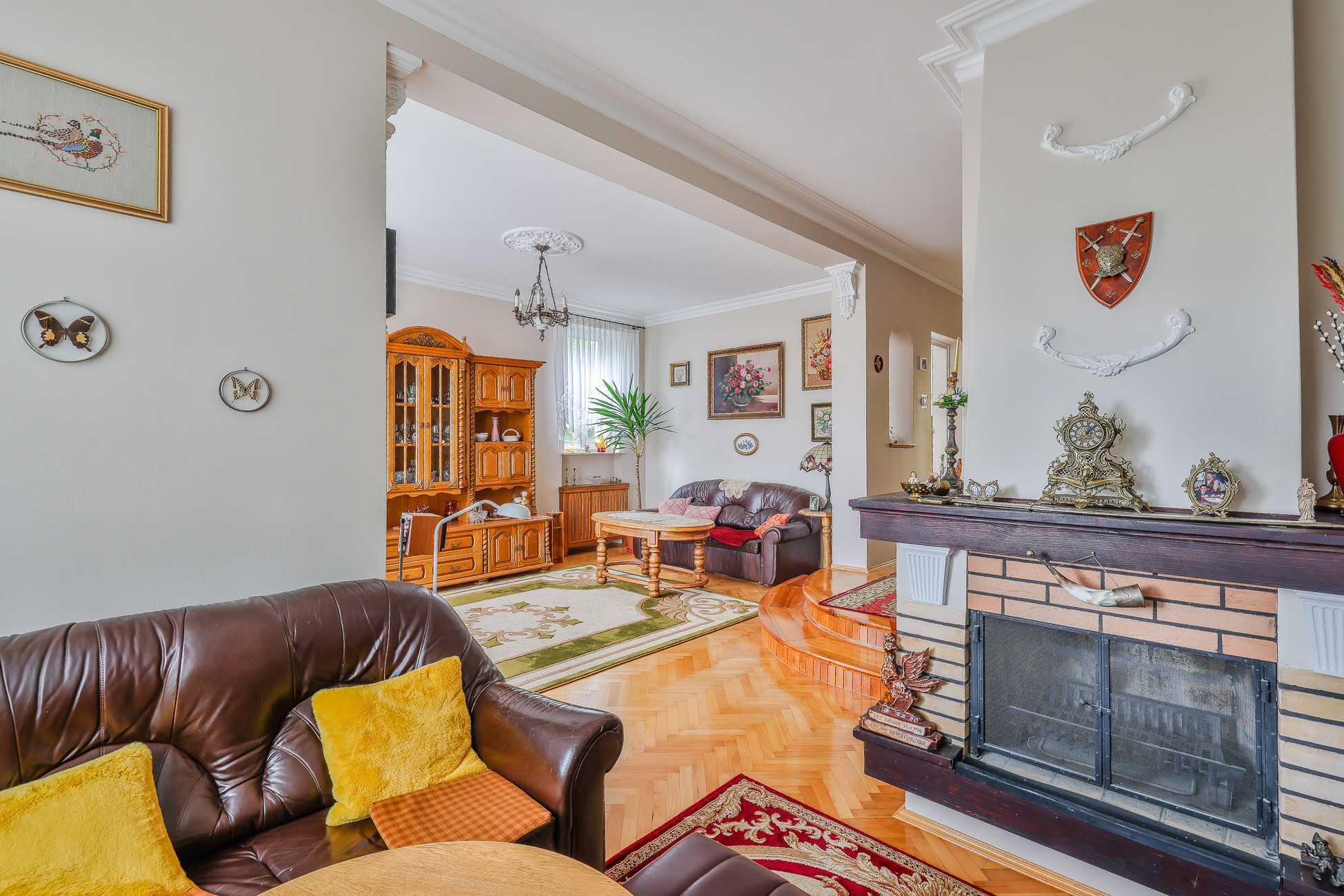 – salon z kominkiem (29,8 m2) z wyjściem na taras (18,5 m2);
