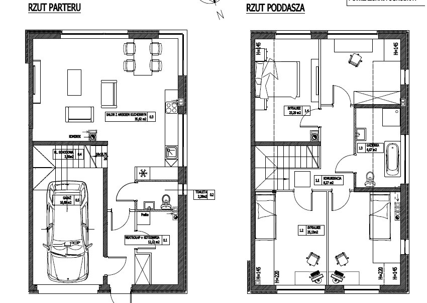 Dom dwu poziomowy z garażem w bryle budynku. Pow. użytkowa 133,12m2, pow. całkowita 162,44. Garaż o pow. 16,72m2