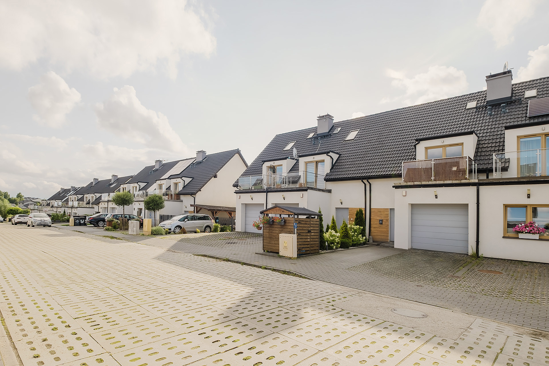– Droga dojazdowa asfaltowa, wewnętrzna między szeregami szeroka wyłożona płytami jumbo