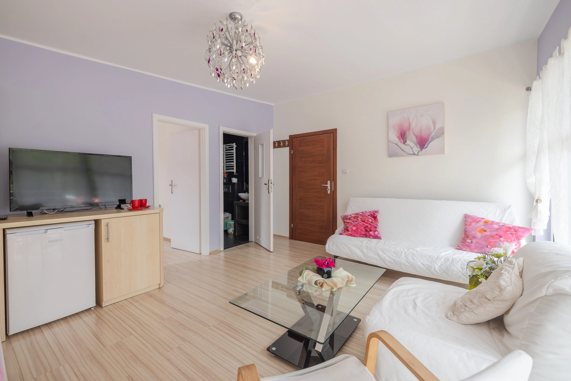 W skład czterokondygnacyjnej nieruchomości (przyziemie, parter, dwa piętra) wchodzi niezależny lokal mieszkalny oraz 13 niezależnych apartamentów 2 pok. lub pokoi o różnym standardzie, każdy wyposażony w lodówkę, z własną łazienką, a niektóre są z aneksem kuchennym i balkonem.
