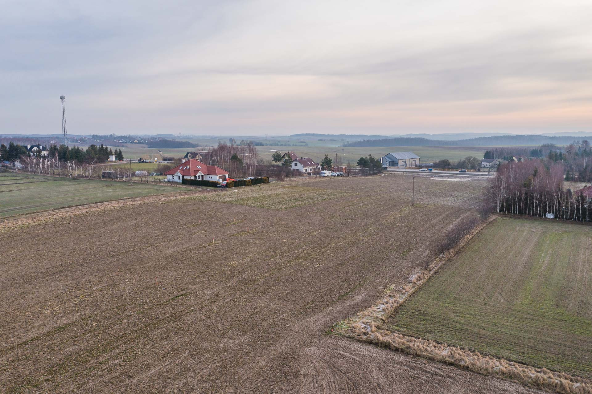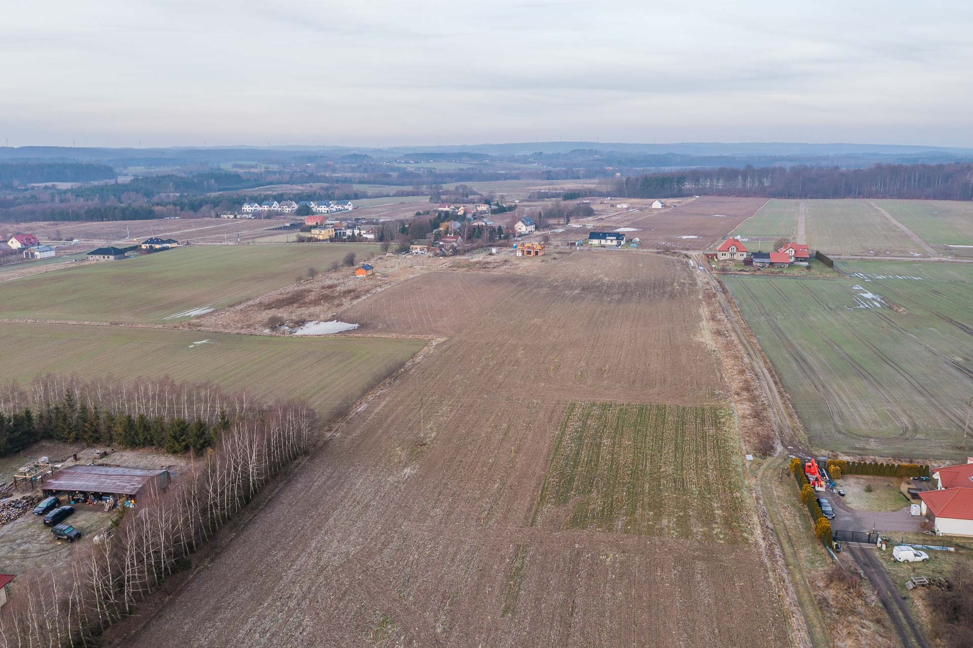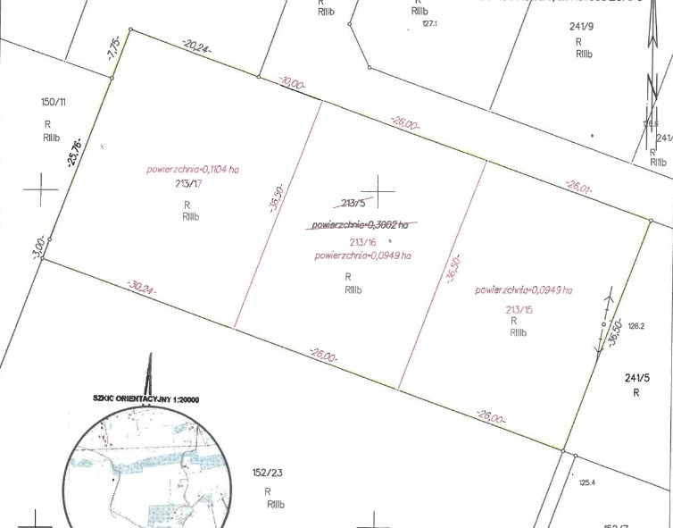 Prostokątna działka budowlana nr 213/16 (po podziale z działki 213/5) o powierzchni 949m2. Leży na małym wzniesieniu, dzięki czemu nie będzie problemów z odprowadzeniem wody deszczowej.