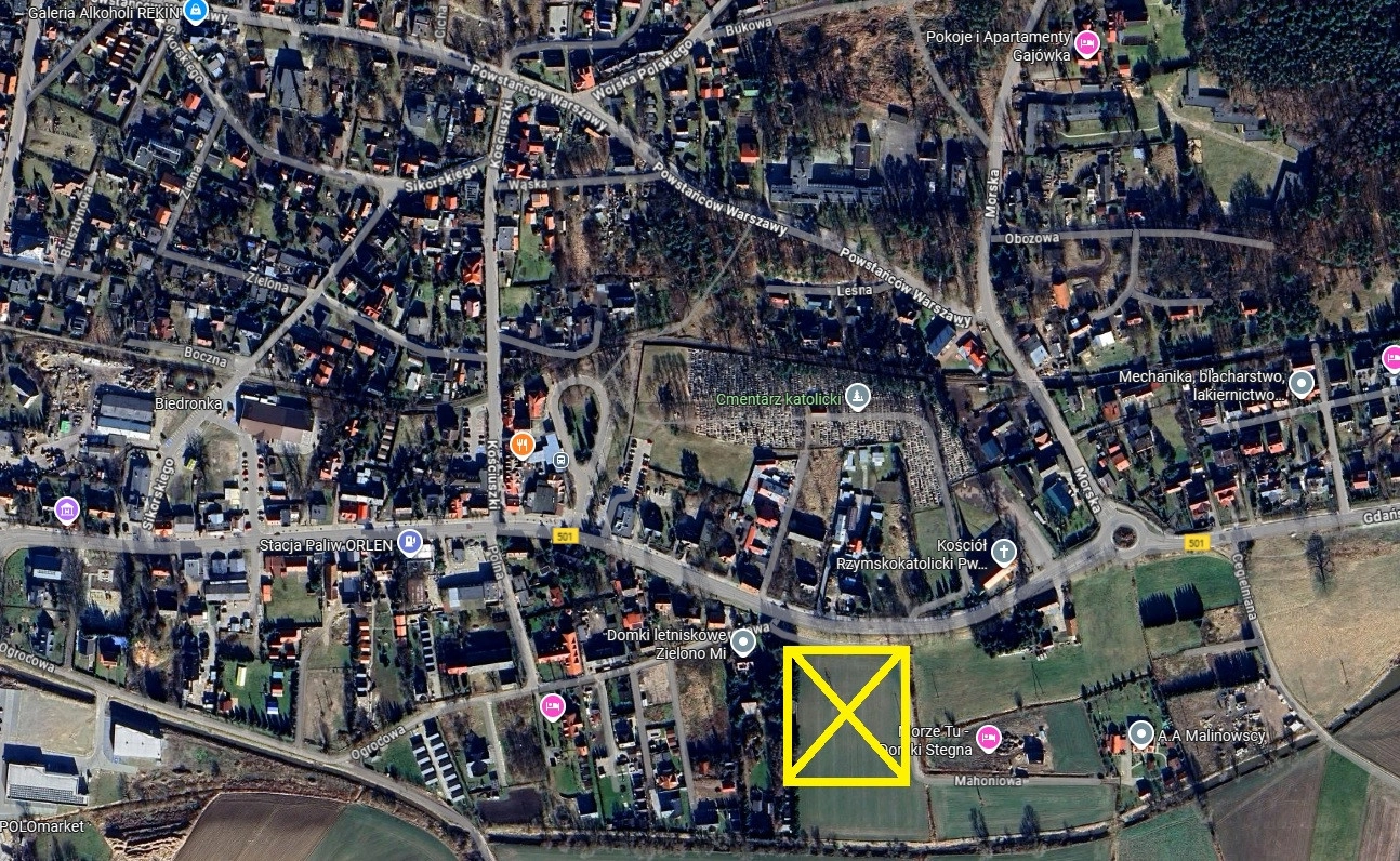 Działka oddalona około 3 km do morza. Doskonały dojazd , położona przy ul. Mahoniowej
