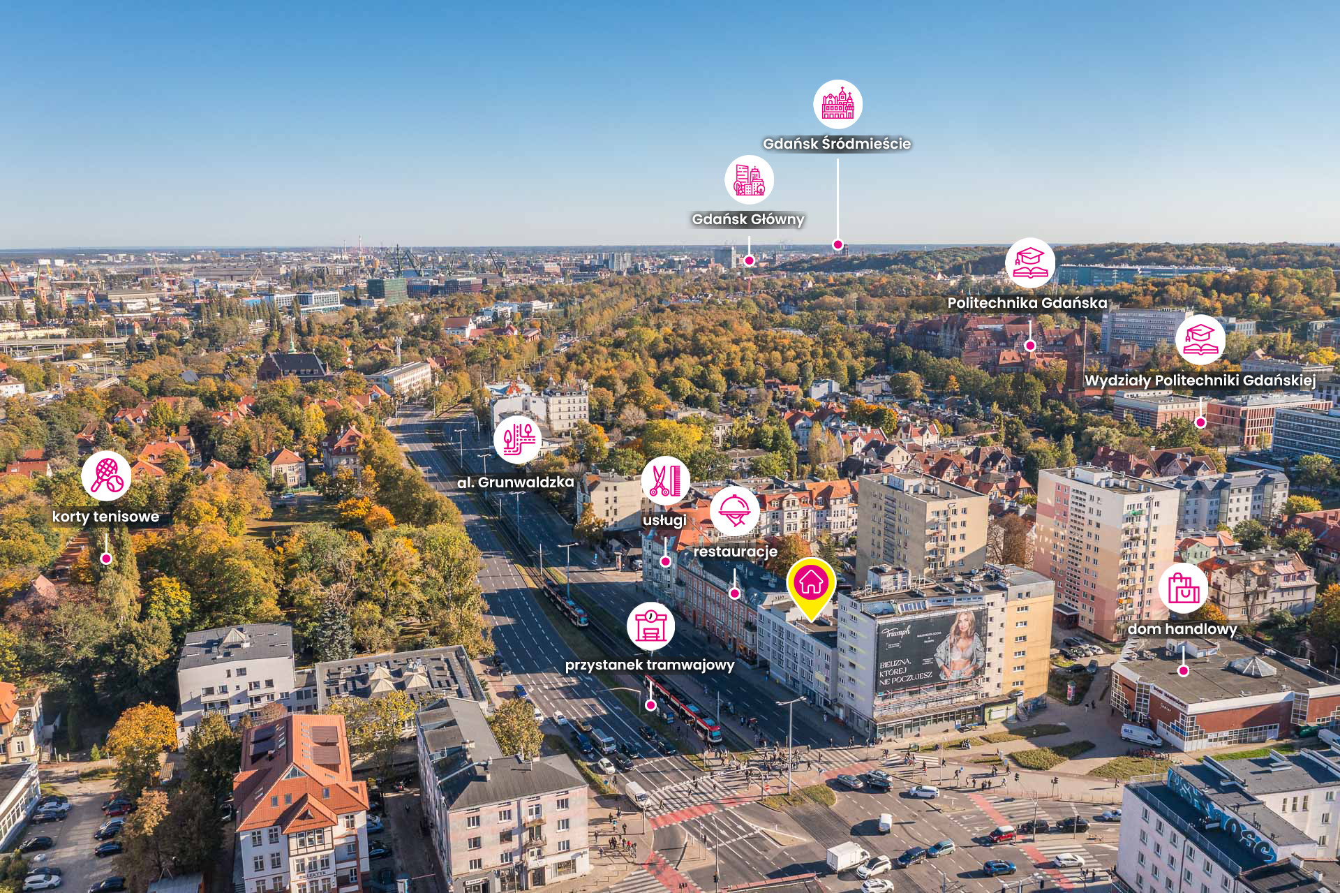 Lokal znajduje się w jednej z najbardziej pożądanych dzielnic Gdańska – Wrzeszczu, bezpośrednio przy ul. Grunwaldzkiej, głównej arterii komunikacyjnej Trójmiasta. To doskonała lokalizacja pod wynajem inwestycyjny – zarówno dla studentów, jak i młodych pracowników.