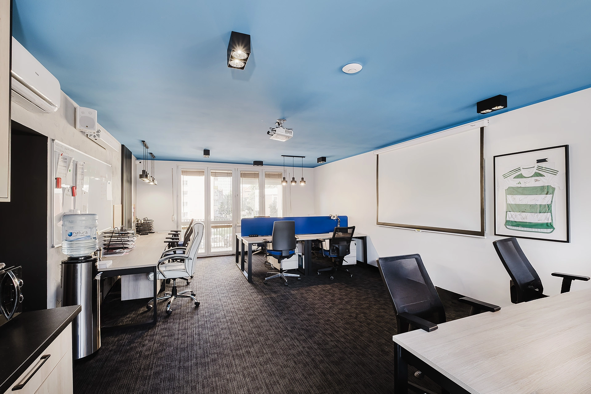 -Dużej, dobrze doświetlonej sali z małym aneksem kuchennym i wyjściem na balkon (ok. 44 m²)