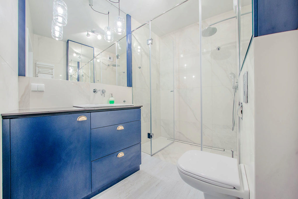 – łazienka z prysznicem, umywalką, lustrem oraz WC,