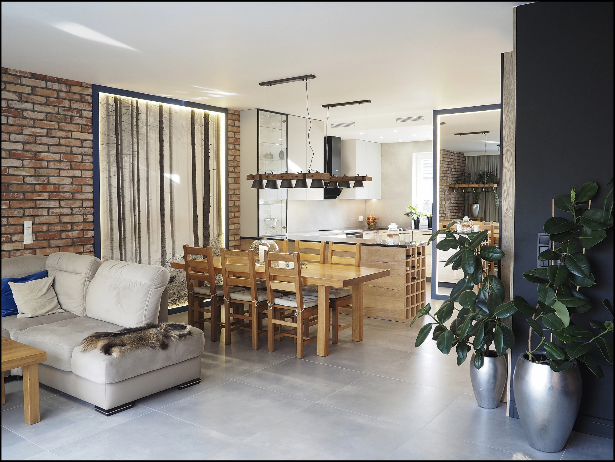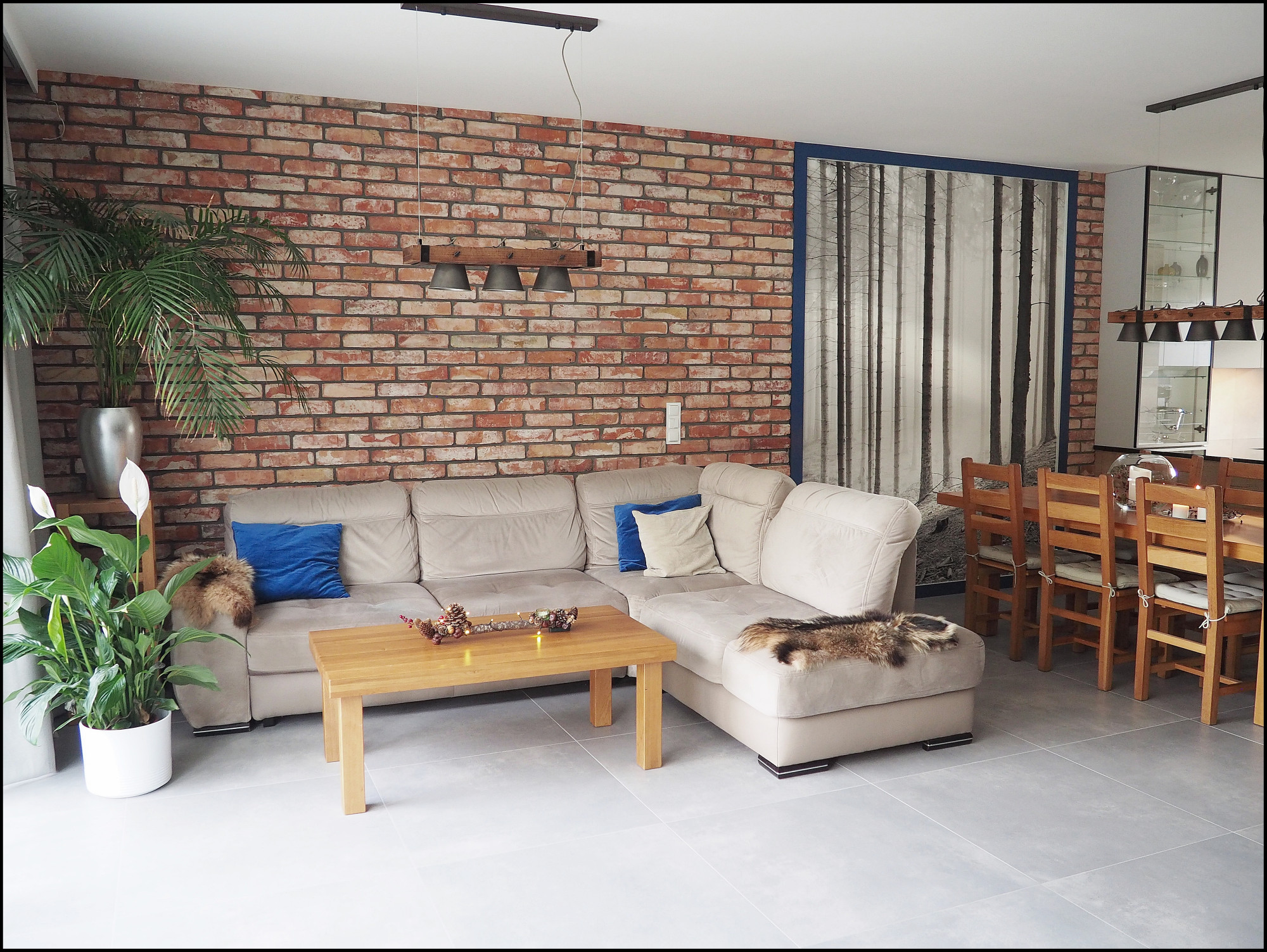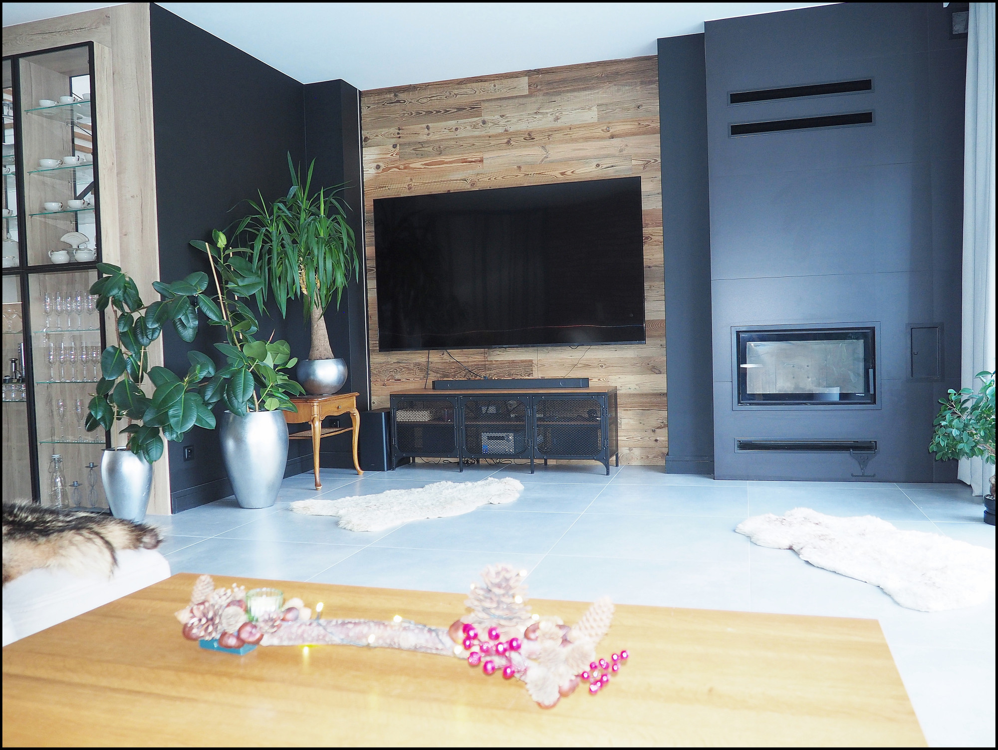 – dużego salonu dziennego z aneksem kuchennym o pow. łącznej ok. 49 m2 z wyjściem przez taras do ogrodu (taras o pow. ok. 20 m2 wykończony płytami wentylowanymi 60 x 60 cm; z boku pokoju schody prowadzące na piętro; w salonie bardzo ładnie wykończony kominek, który ciepło dostarcza także do jednej z sypialni na piętrze,