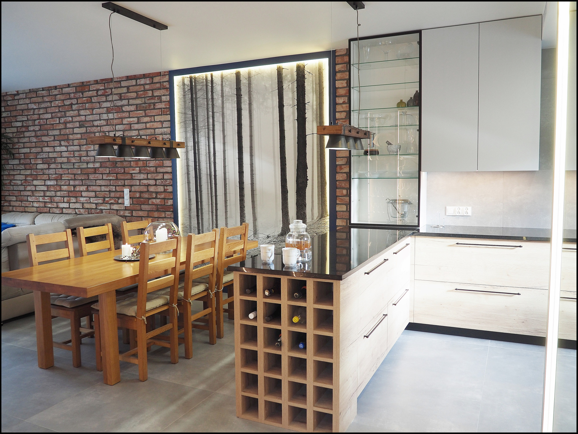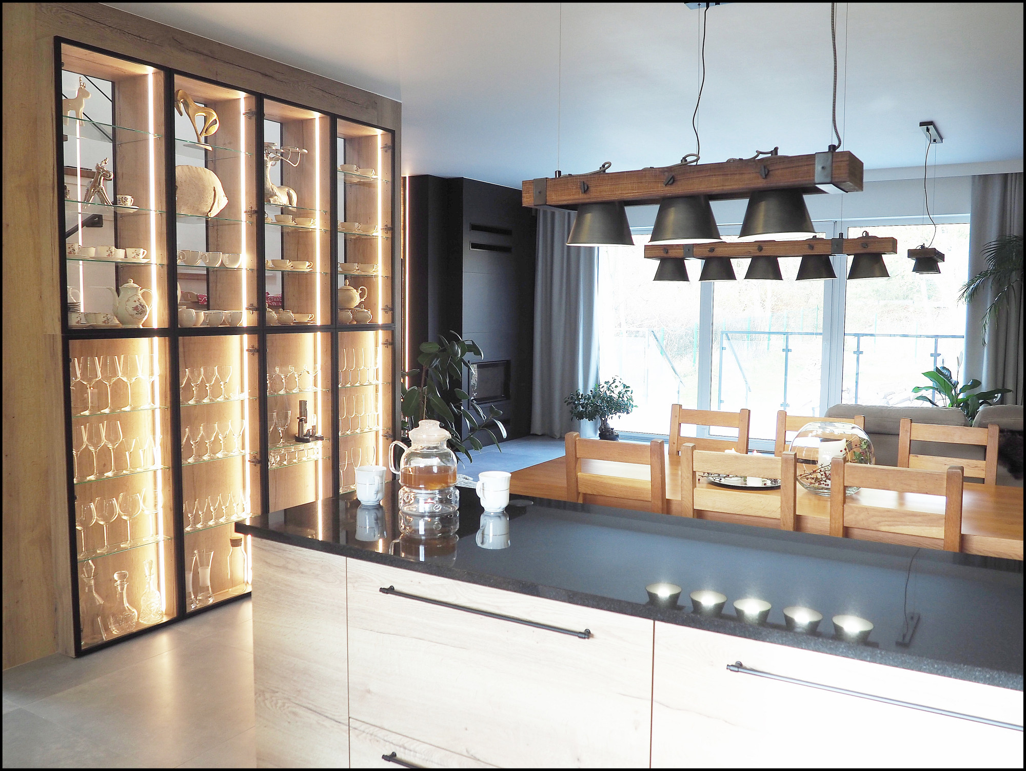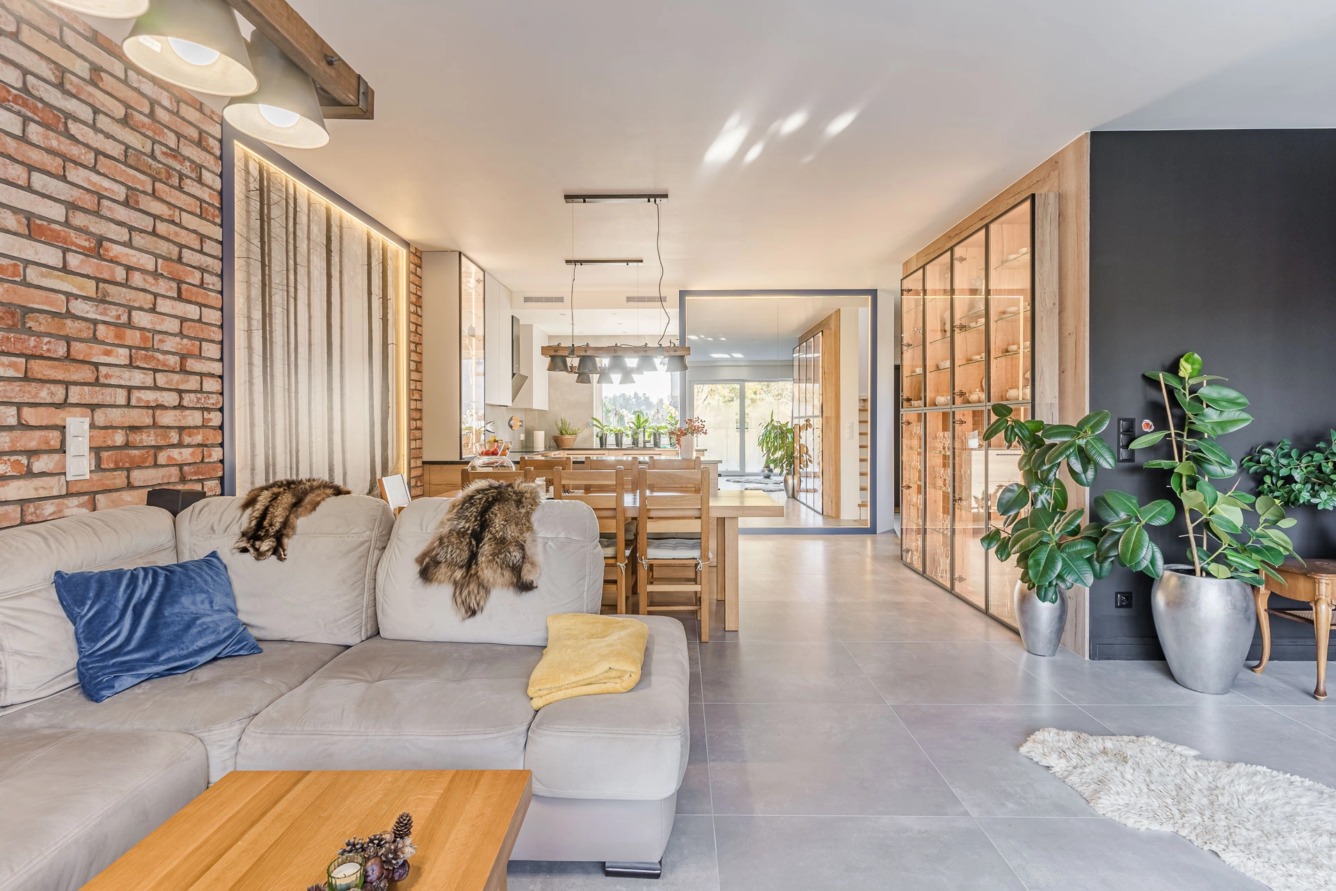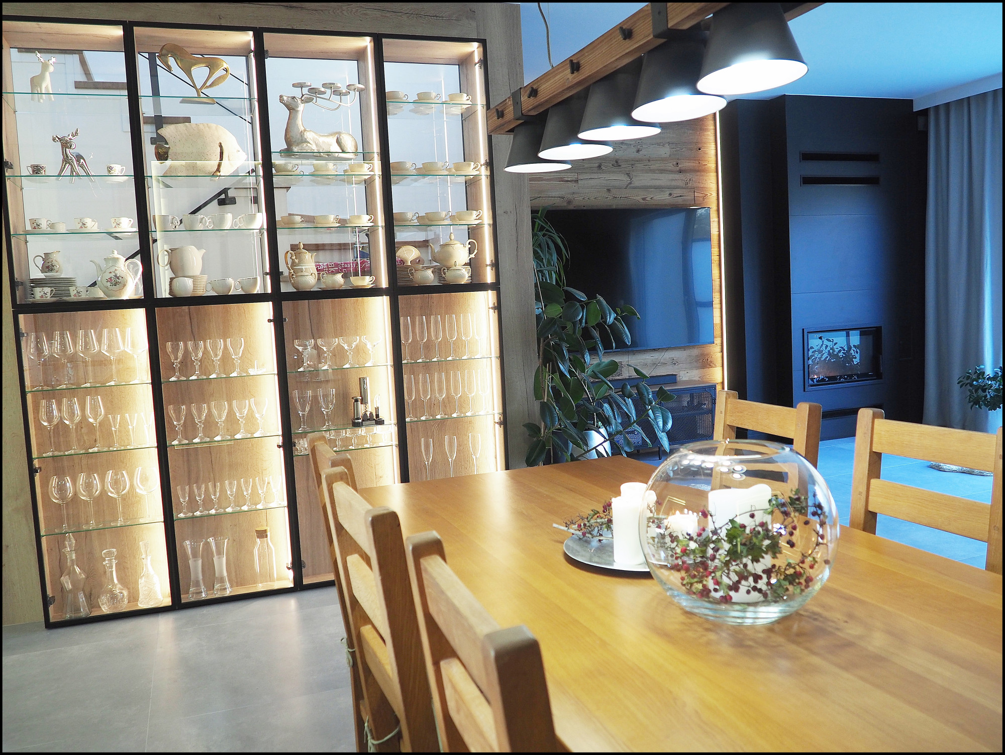 – dużego salonu dziennego z aneksem kuchennym o pow. łącznej ok. 49 m2 z wyjściem przez taras do ogrodu (taras o pow. ok. 20 m2 wykończony płytami wentylowanymi 60 x 60 cm; z boku pokoju schody prowadzące na piętro; w salonie bardzo ładnie wykończony kominek, który ciepło dostarcza także do jednej z sypialni na piętrze,