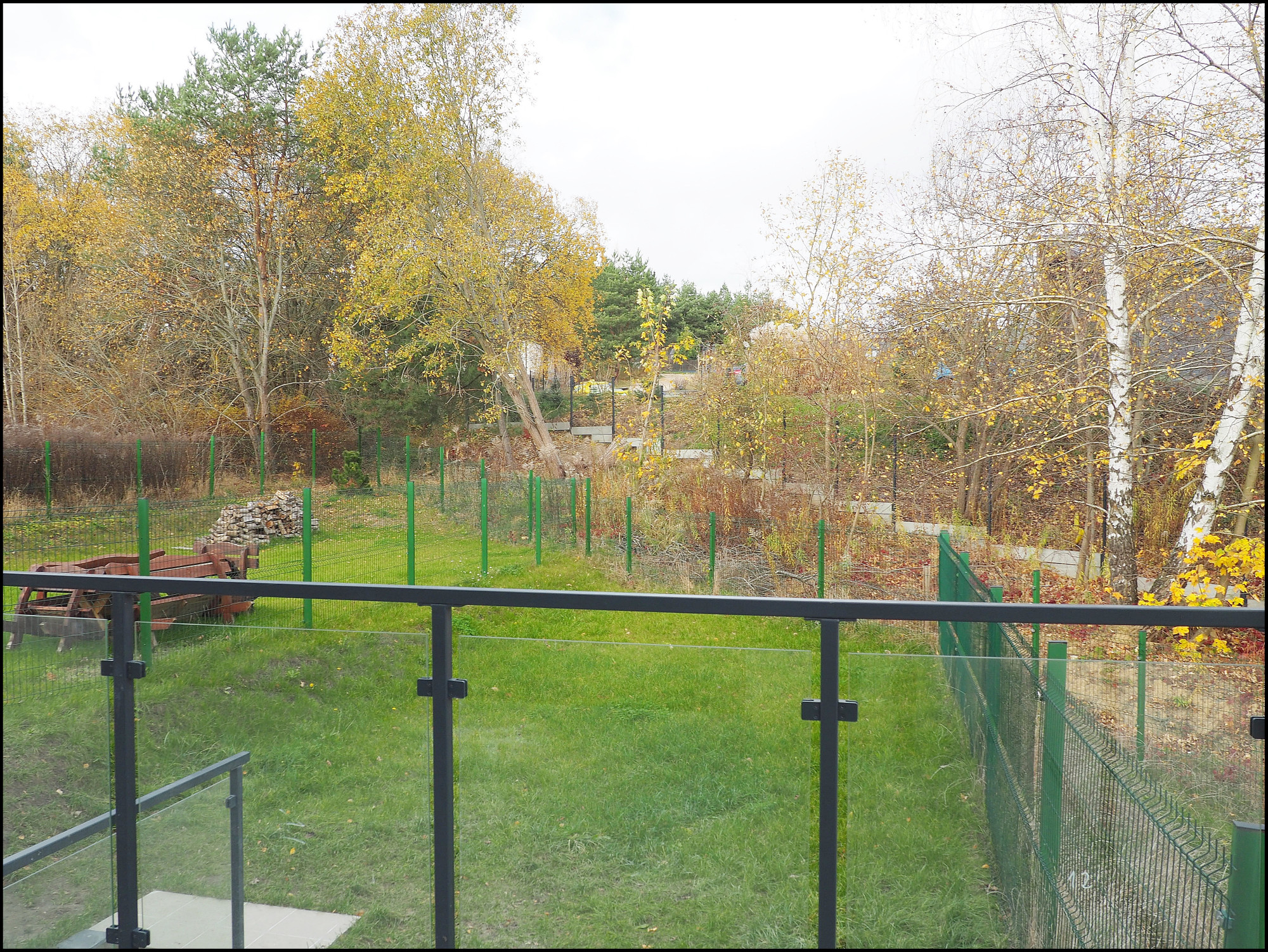 OGRÓD: obsadzony trawnikiem i ogrodzony siatką panelową. Od frontu brak ogrodzenia, dwa murki odgradzające wejście do domu i wjazd do garażu. Na posesji wkopany zbiornik na deszczówkę.
