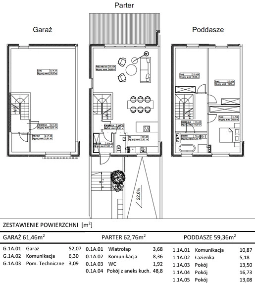 – garaż na 2 samochody (jeden za drugim) o pow. ok. 52 m2,