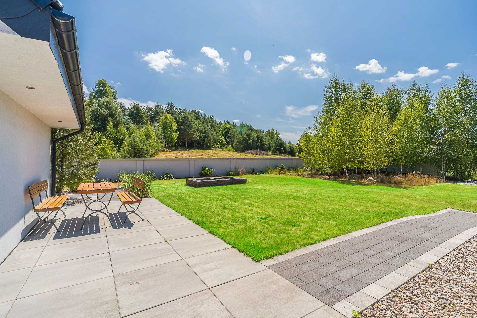 Ogród jest dwupoziomowy. Dolny taras wyłożony jest dużymi płytami oraz otoczakami. Jest tam również wymurowane, do wykończenia oczko wodne z kaskadą. Południowo- zachodni ogród posiada bogatą roślinność m.in. hortensje, juki, trawy ozdobne, tuje, bluszcze, wrzosy.