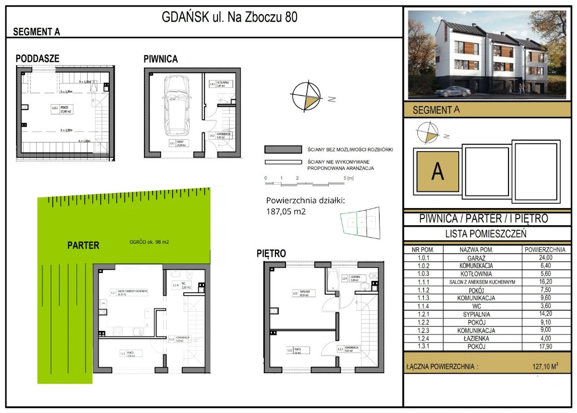 Budynek 5 pokojowy dwu poziomowy o łącznej pow. 127,10m2 z garażem i poddaszem użytkowym w stanie deweloperskim.