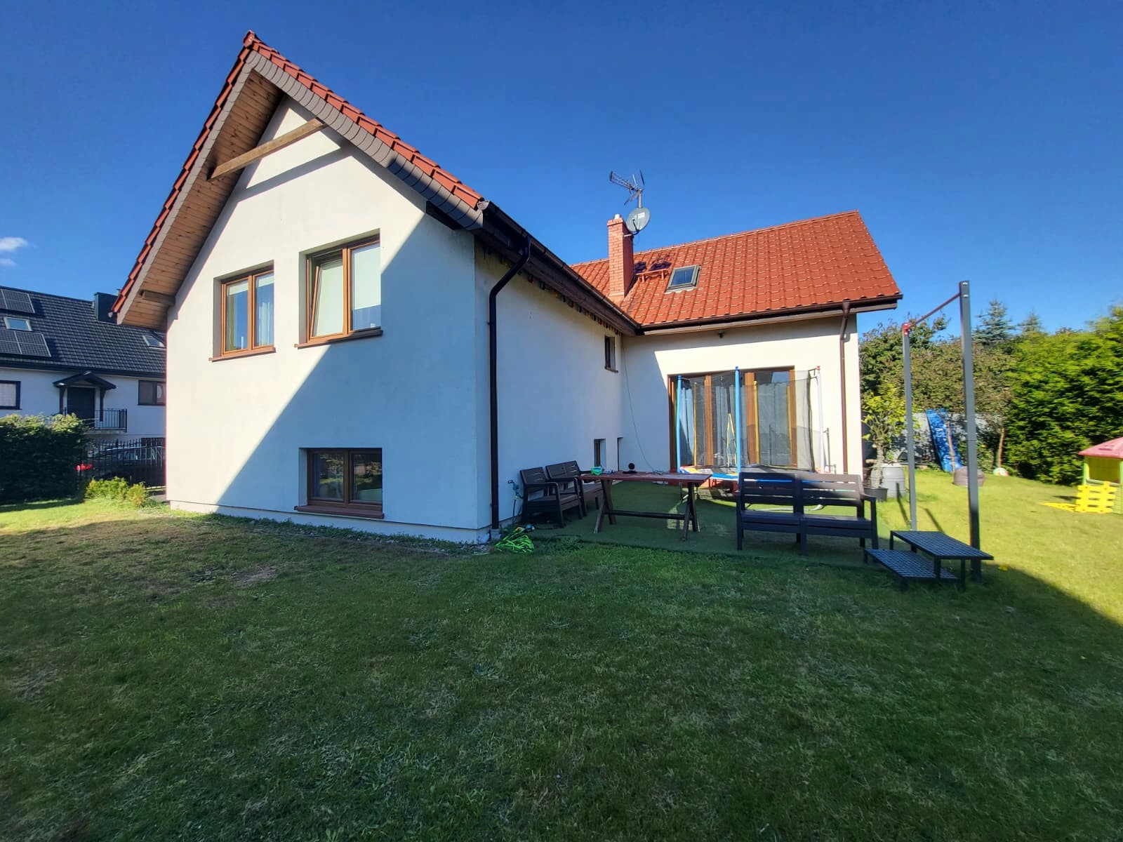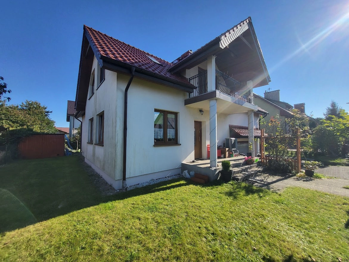 Dom wolnostojący o powierzchni całkowitej 188 m². Powierzchnia użytkowa domu wynosi 169,40 m² ( w tym garaż dwustanowiskowy 26,5 m²). Dom został wybudowany w 2012 r. i jest usytuowany na działce o powierzchni 494m². Działka ogrodzona z zagospodarowanym, płaskim ogródkiem na około domu. Kształt domu w formie litery L gwarantuje jeszcze więcej prywatności. Dodatkowa, duża wiata gospodarcza na posesji.