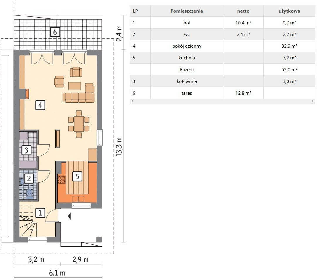 Dom w zabudowie bliźniaczej został zaprojektowany z myślą o komforcie i funkcjonalności. Położony na działce o powierzchni 500 m², oferuje wiele możliwości aranżacyjnych i przestrzeń do wypoczynku.