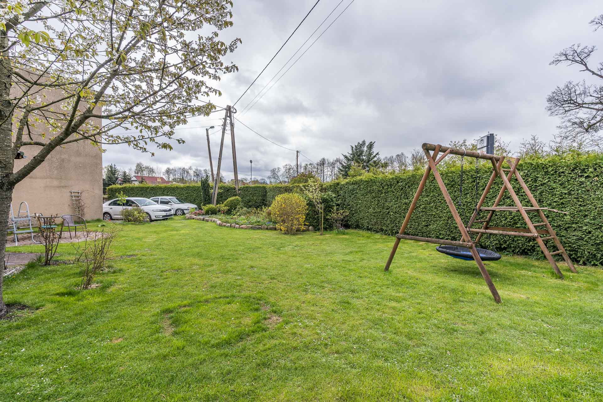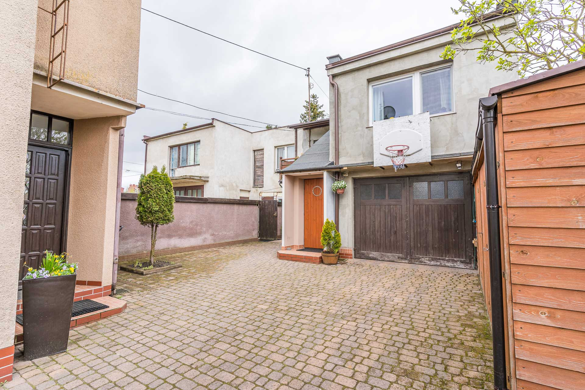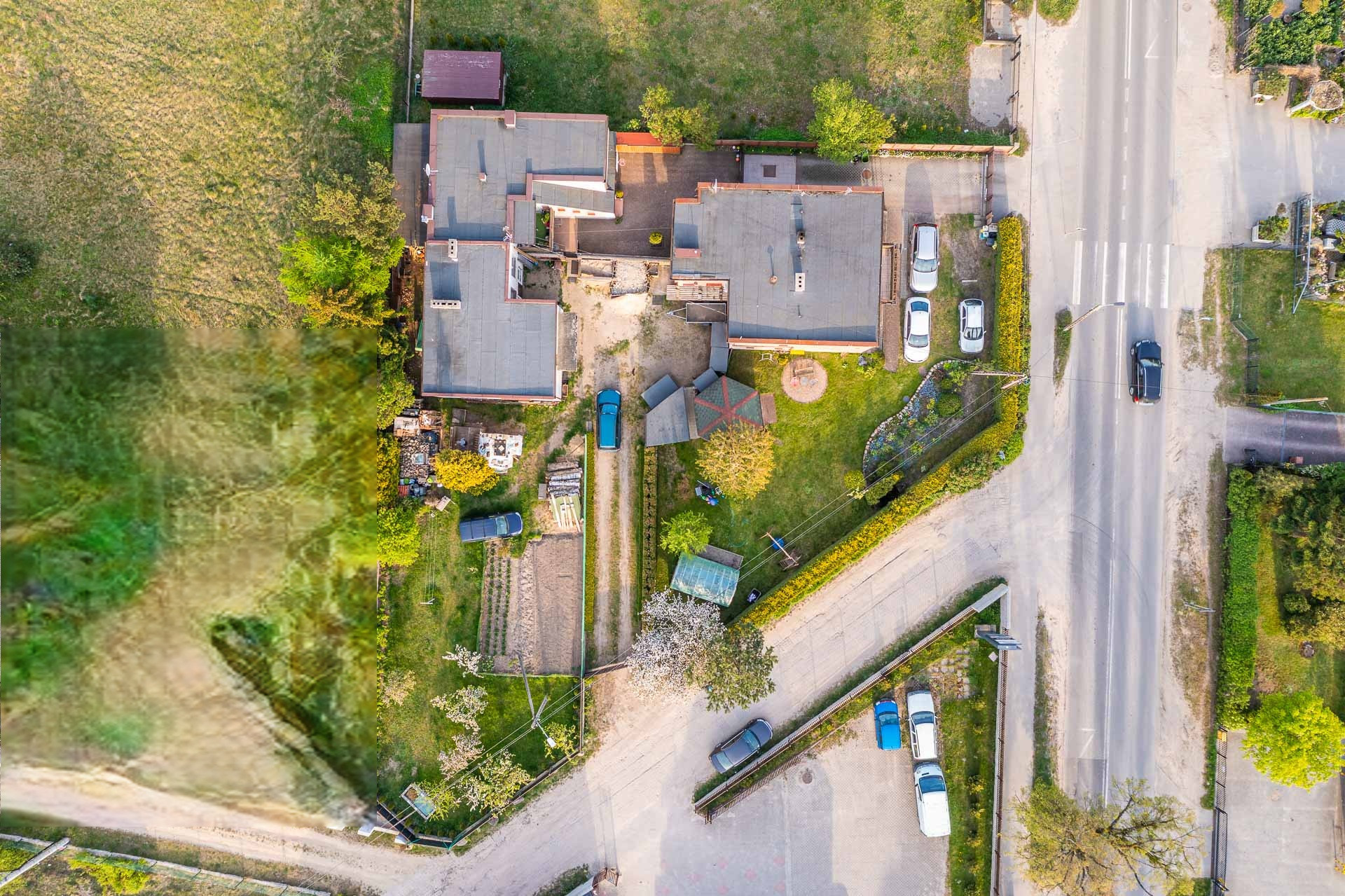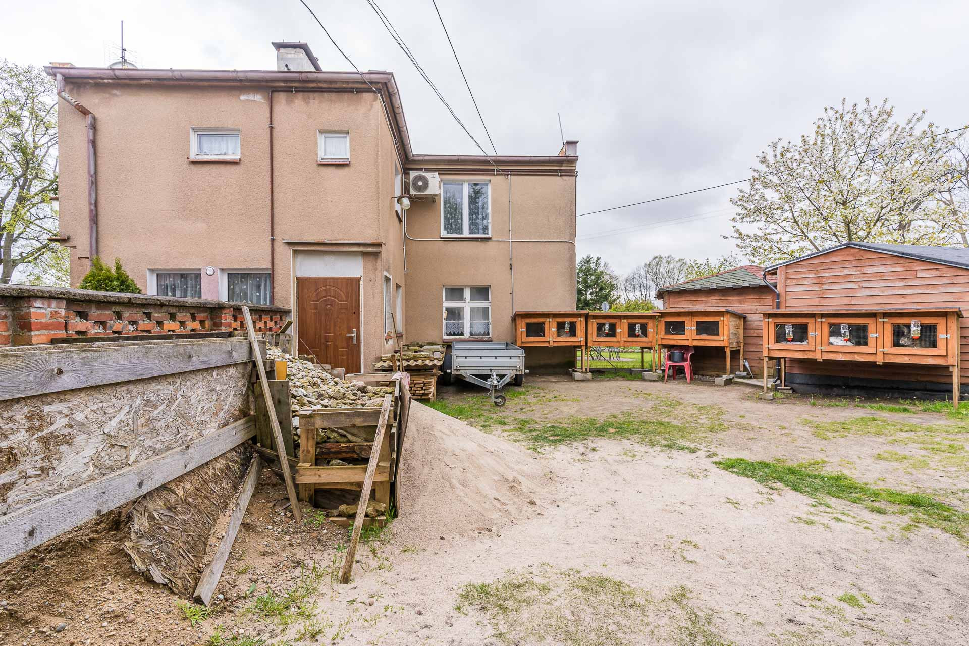 2. Budynek gospdodarczo-usługowy z garażem (z kanałem) i częścią mieszkalną (mieszkanie ok 52m2 na piętrze z niezależnym wejściem) – łącznie ok 200m2 (w tym część do wykończenia), wybudowany w latach 50., rozbudowany w latach 80-90. Duży ogród podzielony na dwie części, altana ogrodowa, całość posesji ogrodzona.