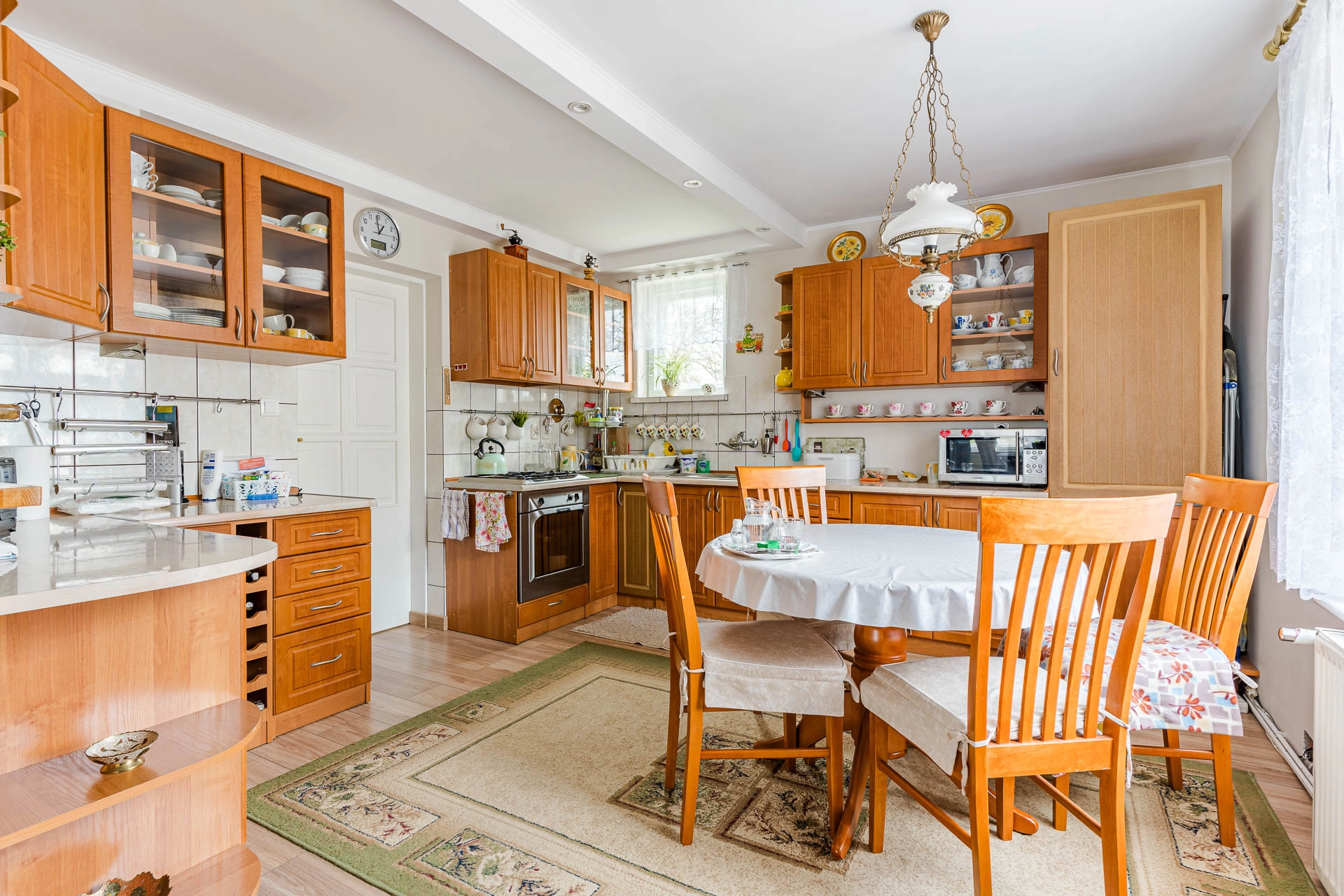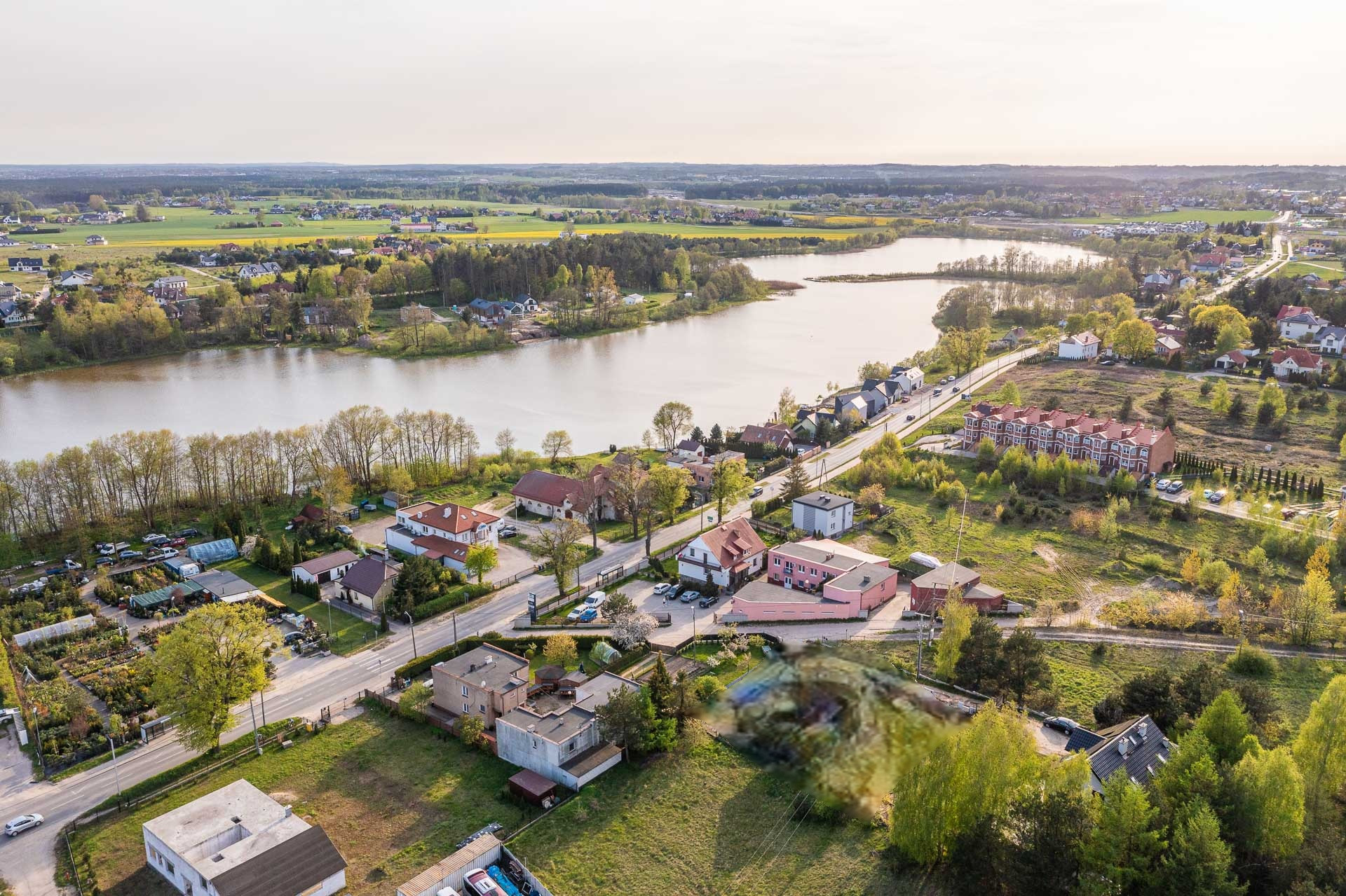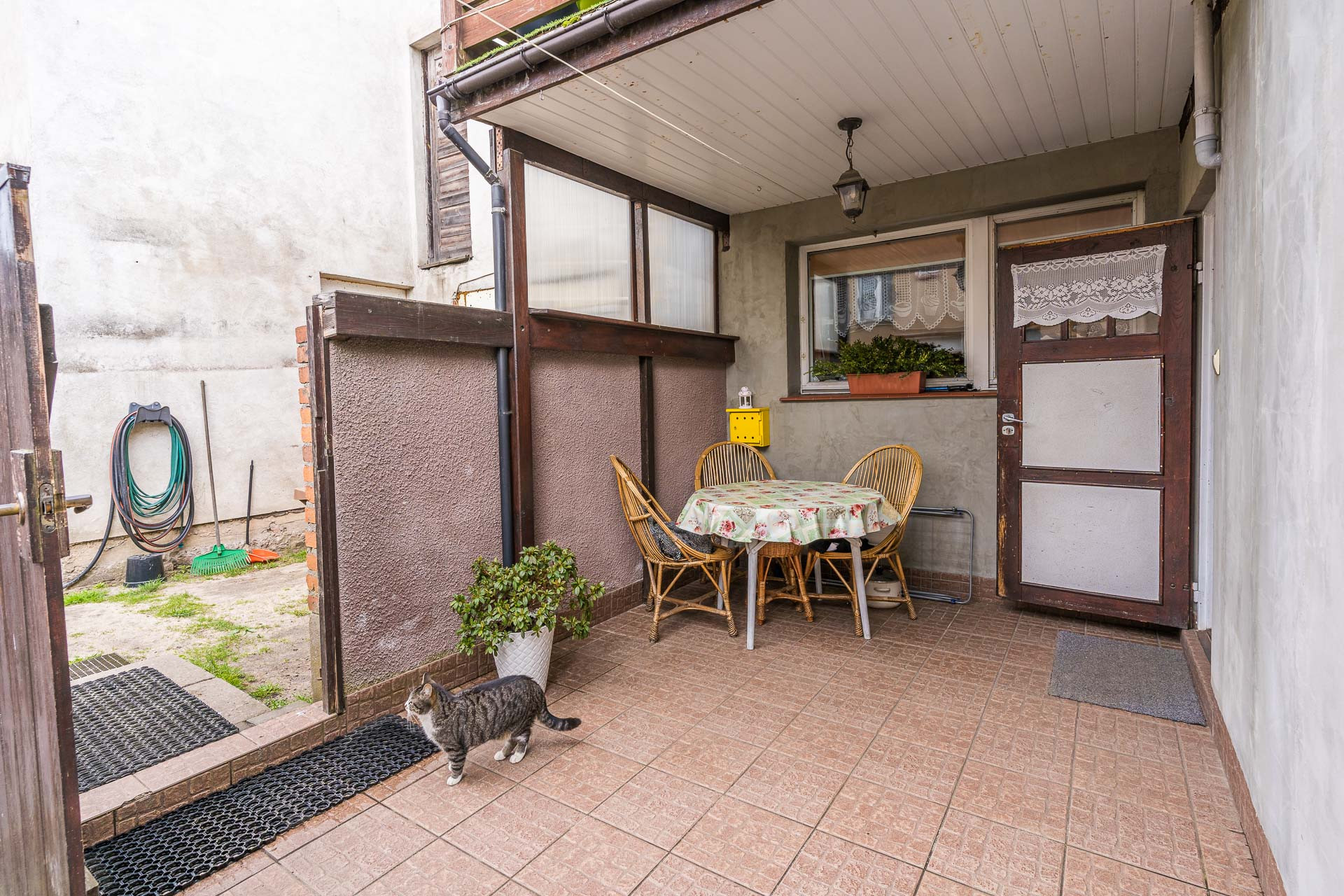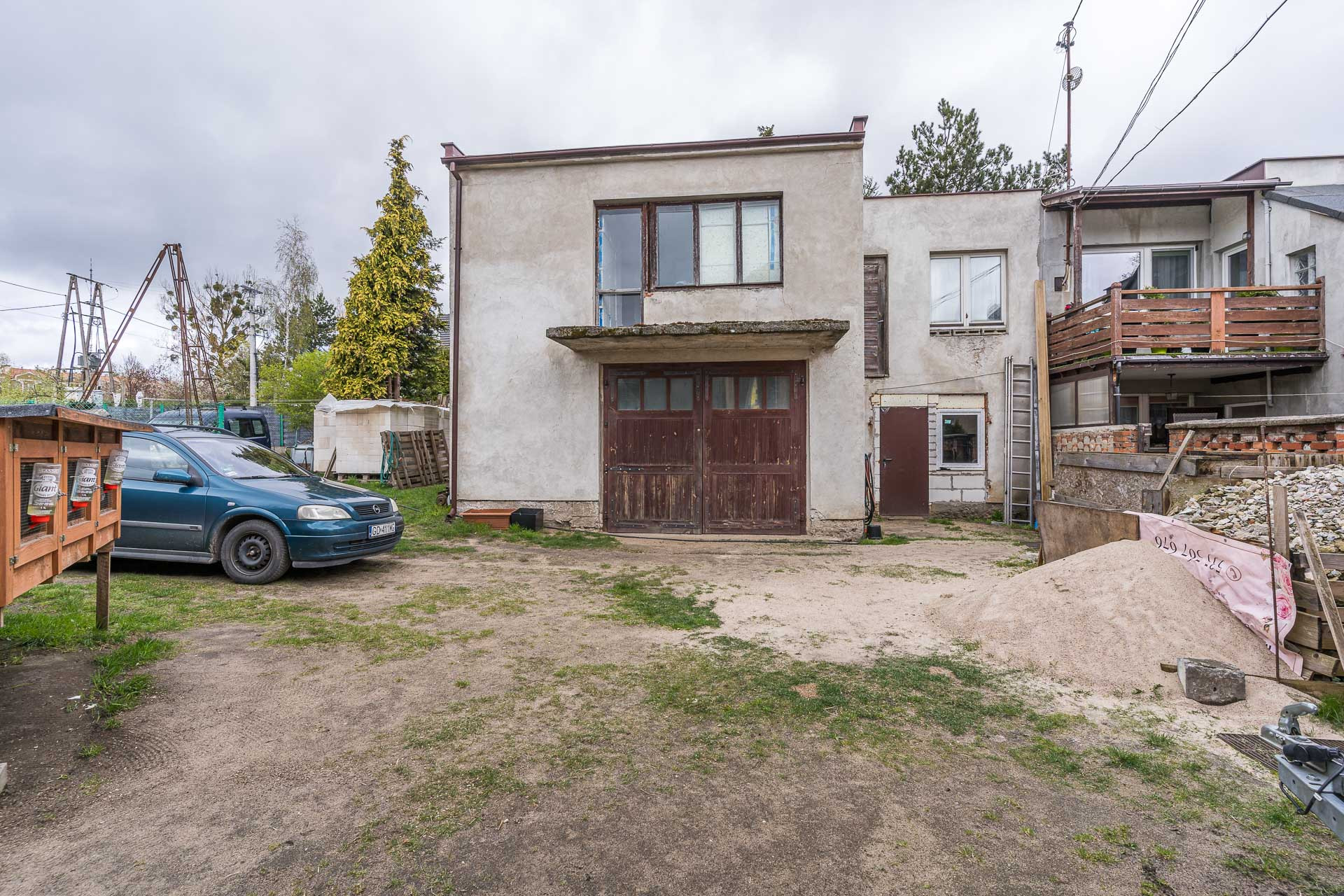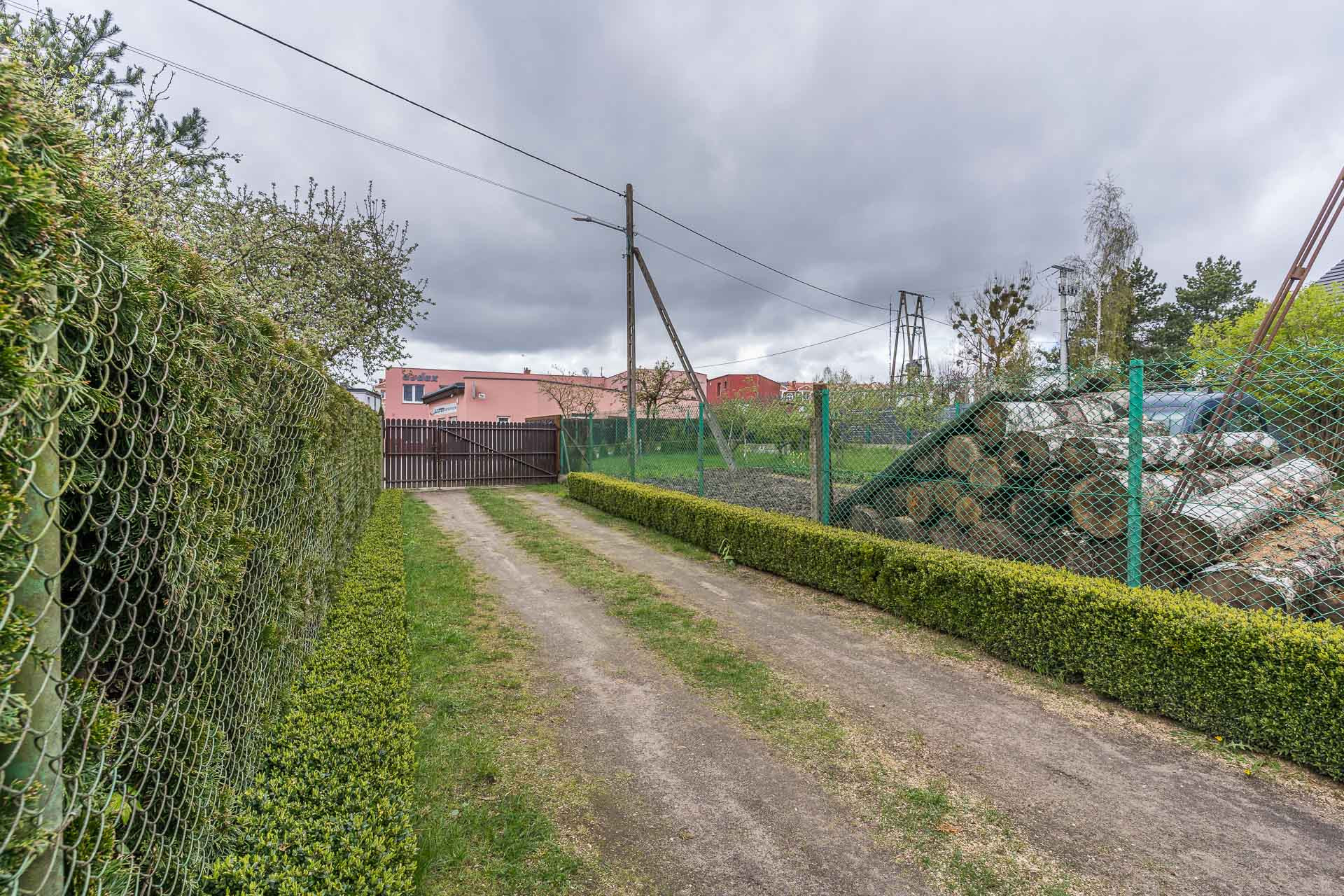 2. Budynek gospdodarczo-usługowy z garażem (z kanałem) i częścią mieszkalną (mieszkanie ok 52m2 na piętrze z niezależnym wejściem) – łącznie ok 200m2 (w tym część do wykończenia), wybudowany w latach 50., rozbudowany w latach 80-90. Duży ogród podzielony na dwie części, altana ogrodowa, całość posesji ogrodzona.