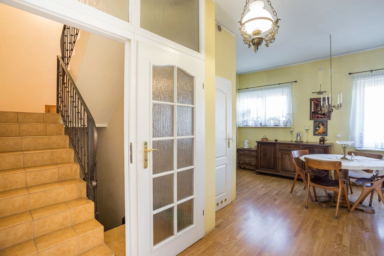 II część to budynek z 1995 roku o pow całkowitej 225 m2, wysokie podpiwniczenie około 75 m2, garaż z małym kanałem. I poziom mieszkalny 75 m2 -przestronny, kuchnia i jadalnia ponad 25 m2 z przejściem do salonu około 40 m2, salon bardzo dobrze doświetlony dzięki stronie południowej oraz oknom z szerokim wyjściem na taras i ogród. Znakomicie wykorzystana przestrzeń, przy kuchni znajduje się spiżarka (schowek) Dodatkowo oprócz 5 metrowego wiatrołapu mamy ponad 5 metrowy korytarz z przejściem do wc.