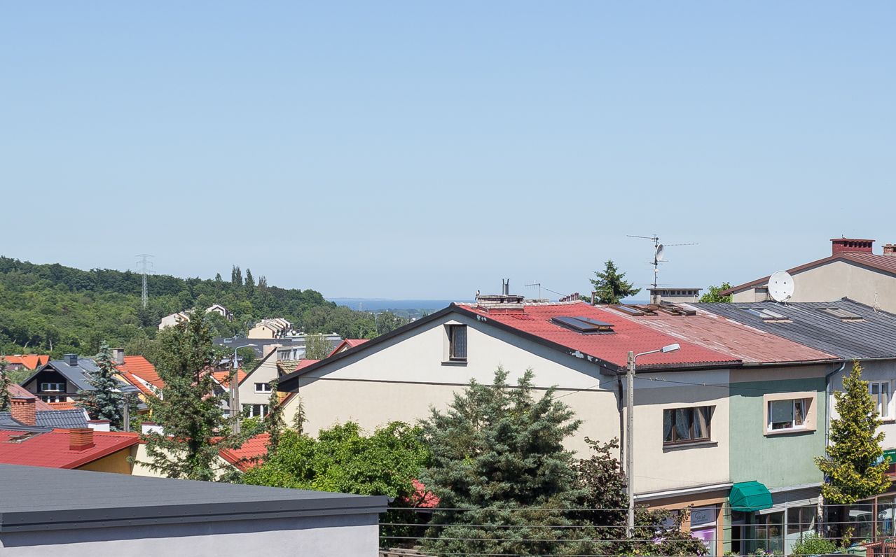 Na drugim poziomie mieszkalnym znajduje się pokój kąpielowy z wanną i kabiną prysznicową oraz trzy ustawne pokoje. W dwóch największych znajduje się stała zabudowa -szafy typu komandor. Dalej z tego poziomu schody prowadzą wyżej na taras dachowy z którego rozpościera się przepiękny widok na całą panoramę miasta oraz na zatokę Gdańską.
