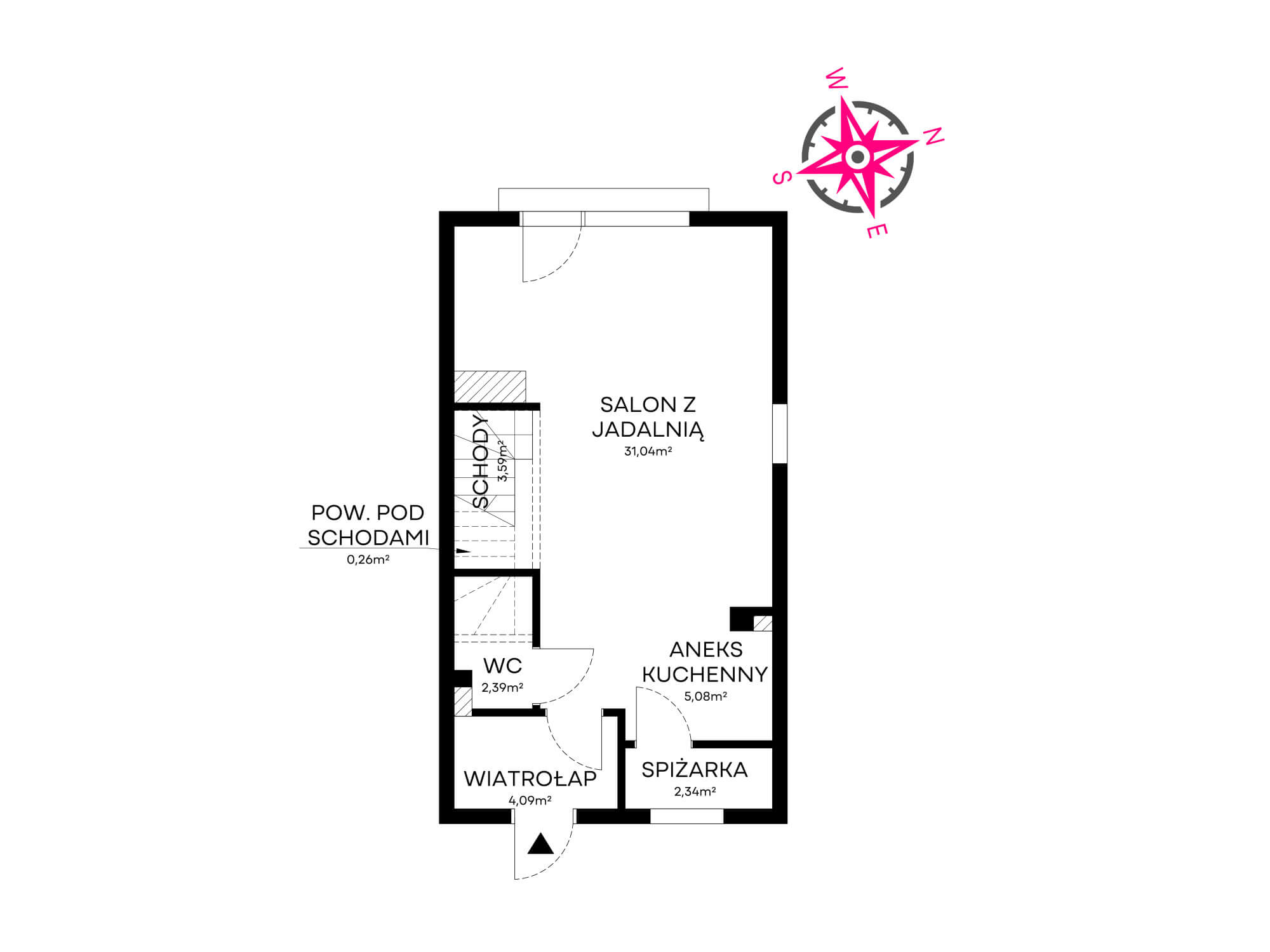 – trzy sypialnie, salon z aneksem kuchennym, spiżarnia, toaleta, łazienka;