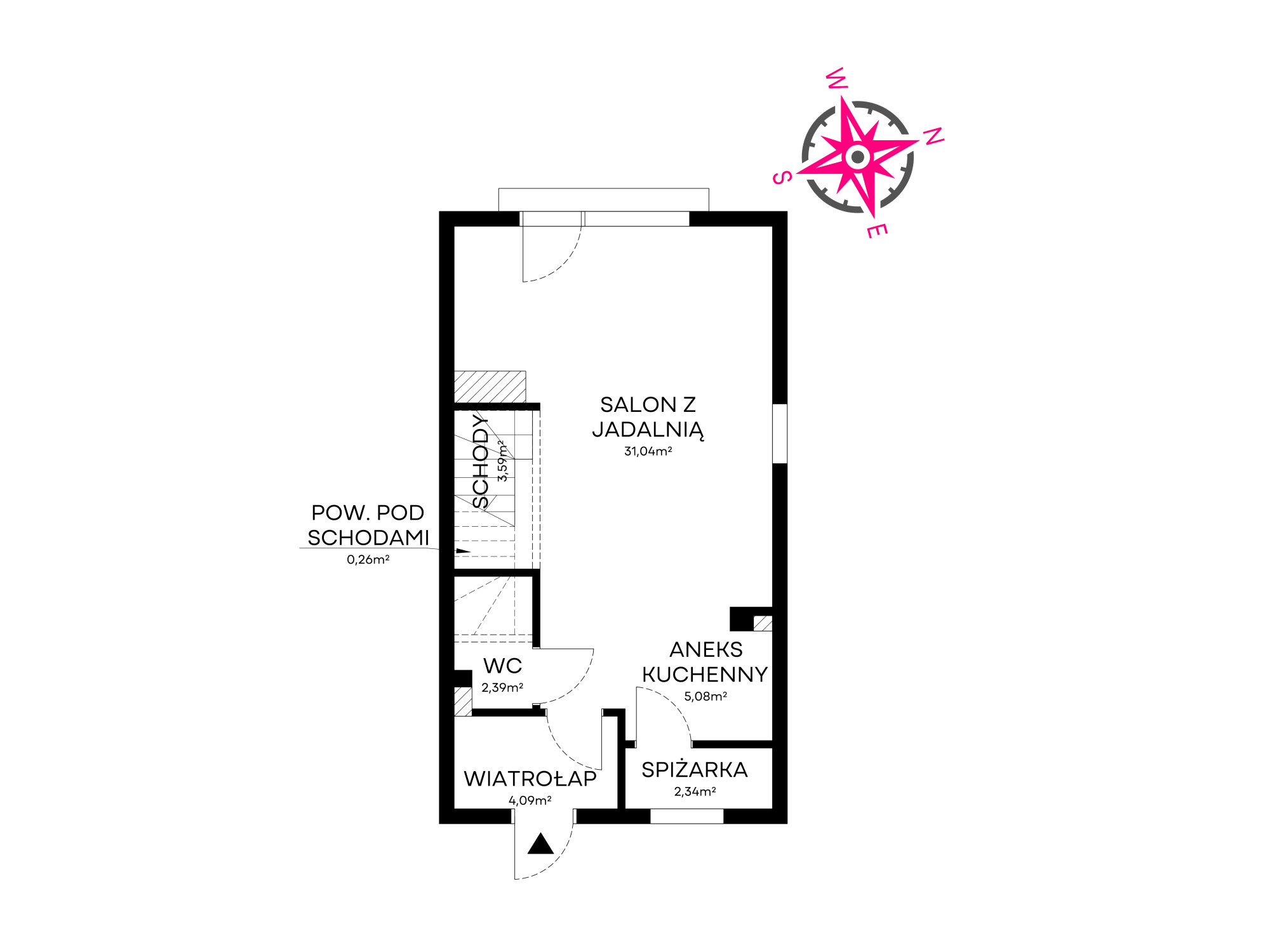 – trzy sypialnie, salon z aneksem kuchennym, spiżarnia, toaleta, łazienka;
