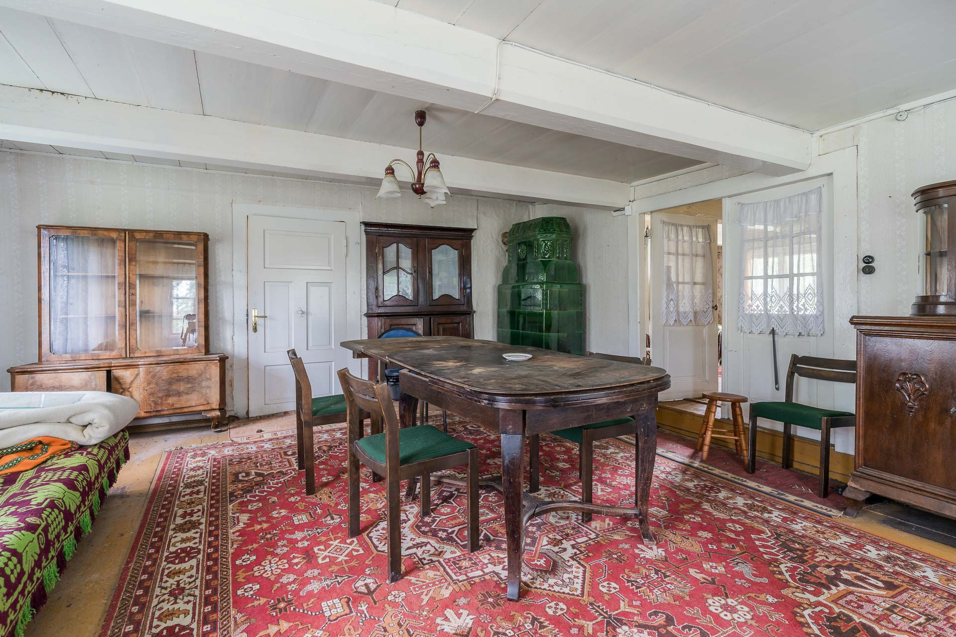 W budynku zachował się oryginalny układ pomieszczeń, m.in. czarna kuchnia pośrodku (użytkowana zgodnie z przeznaczeniem) i wielka izba w południowo-wschodnim narożniku. W niej zachowała się również oryginalna szafa wnękowa i piec kaflowy z „baldachimem”.