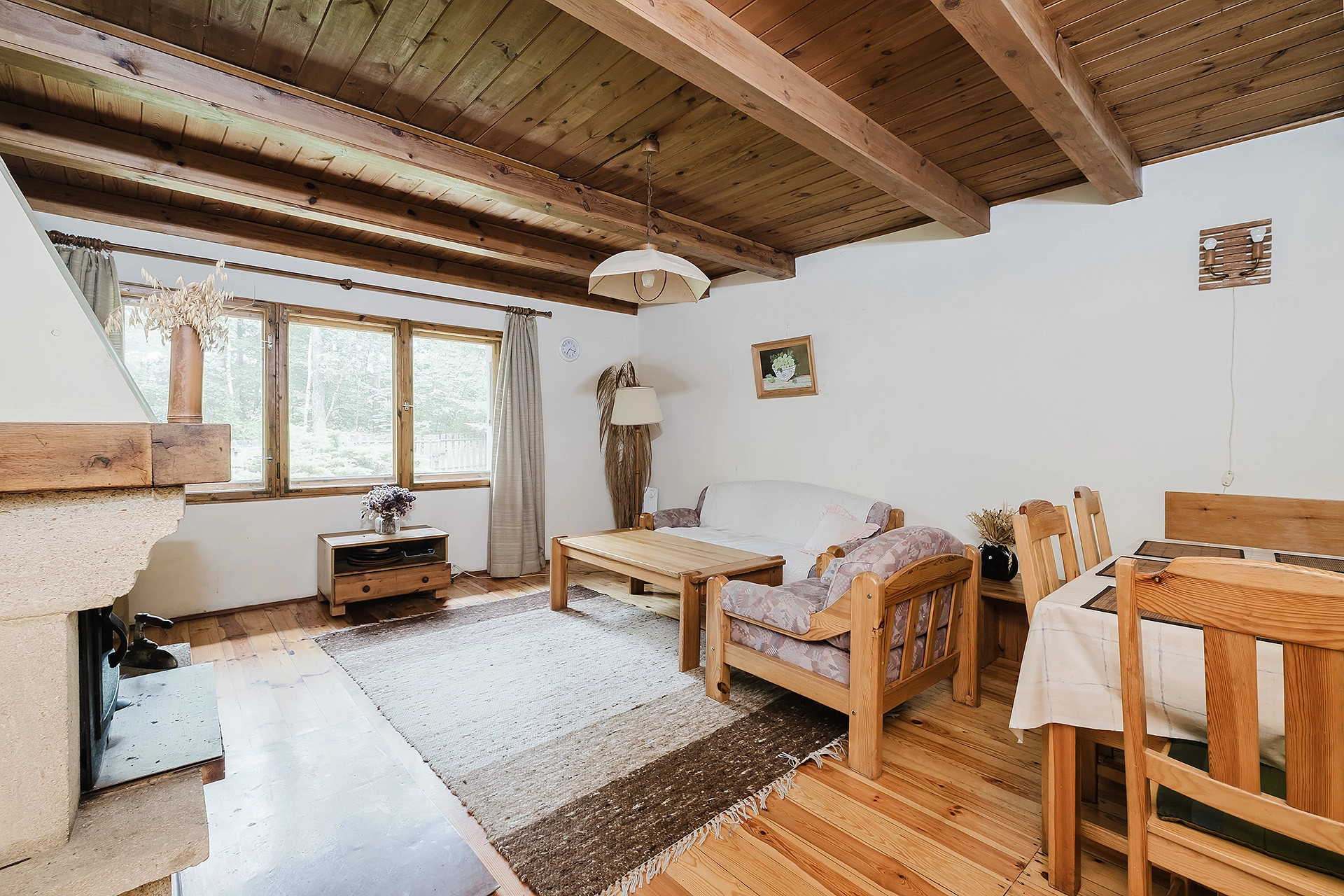 – salon z kominkiem z wyjściem na taras i ogrodu.