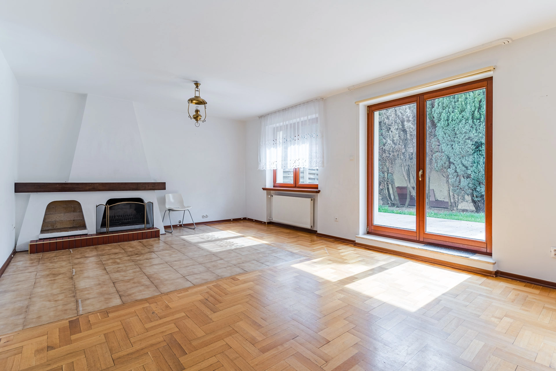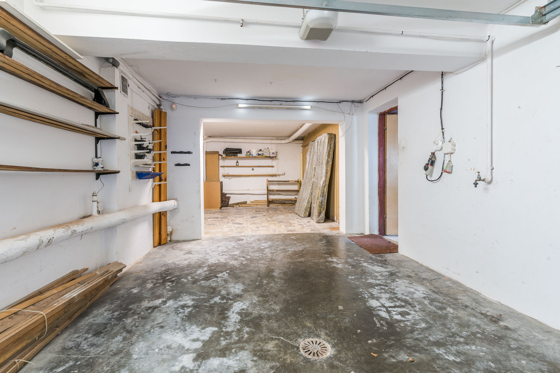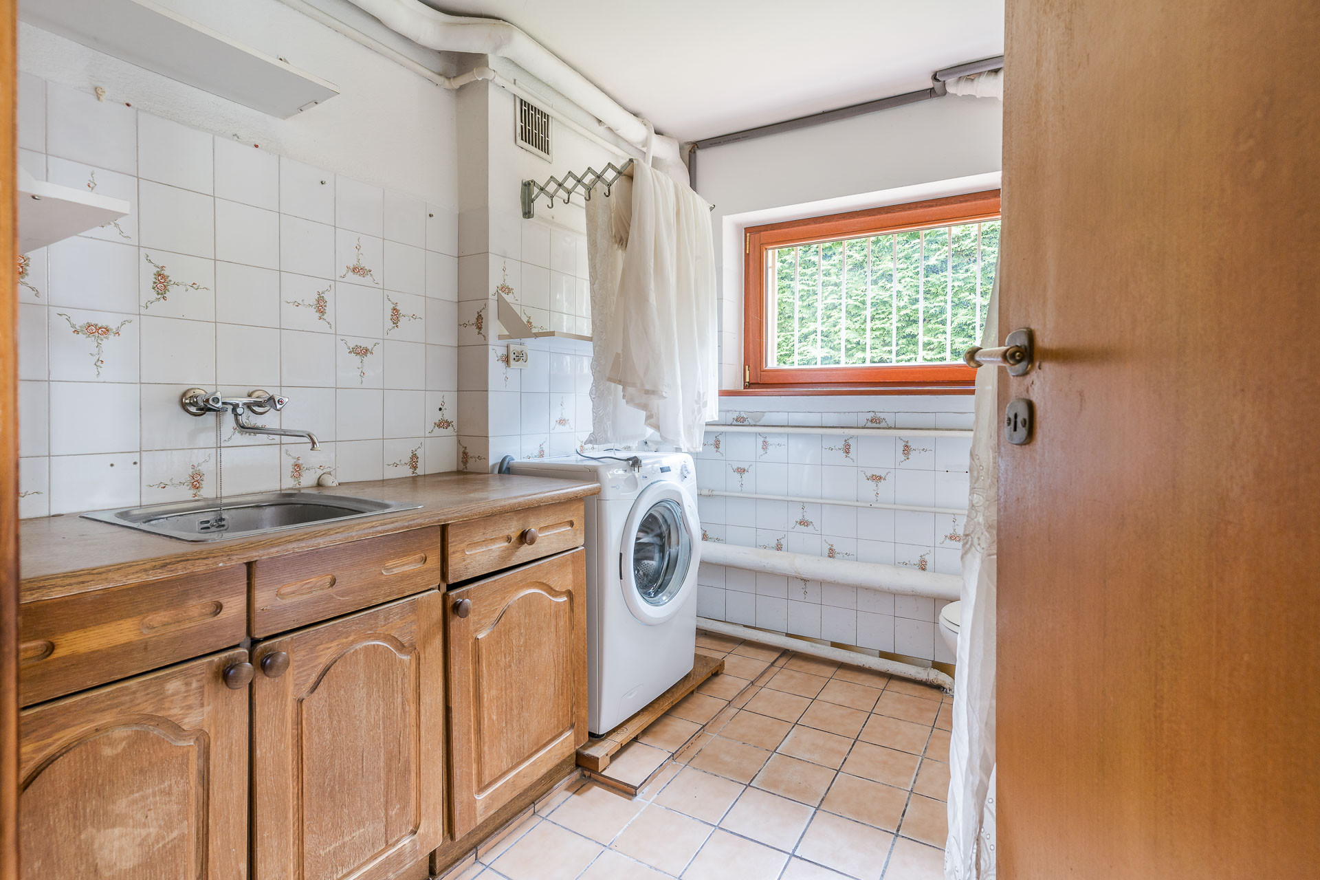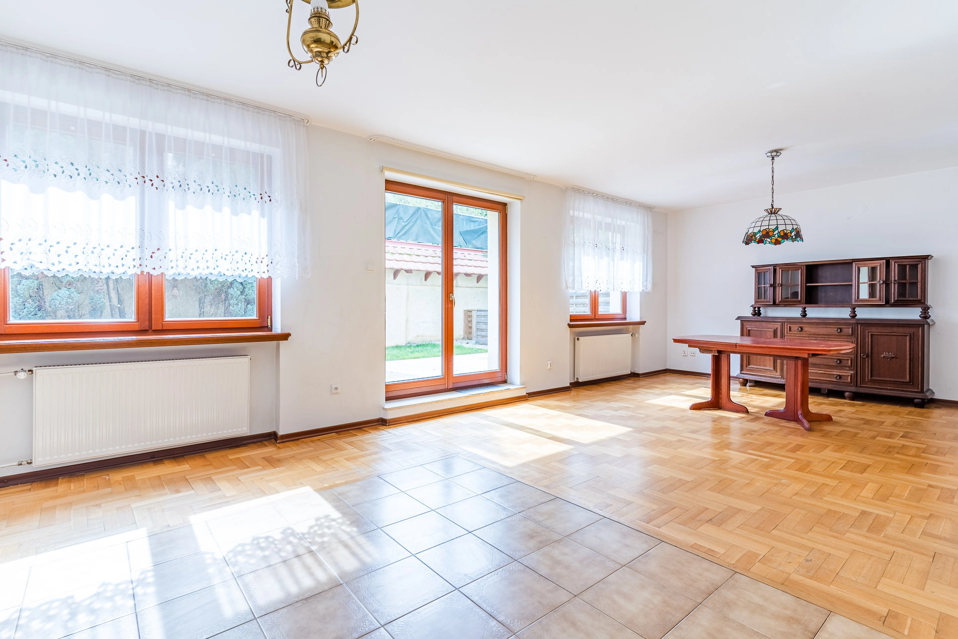 Na poziomie przyziemia mieści się „użytkowa” część nieruchomości i znajdziemy tu dwustanowiskowy garaż, pralnie oraz pomieszczenie z dwoma oknami, które z powodzeniem może zostać przeznaczone na gabinet.