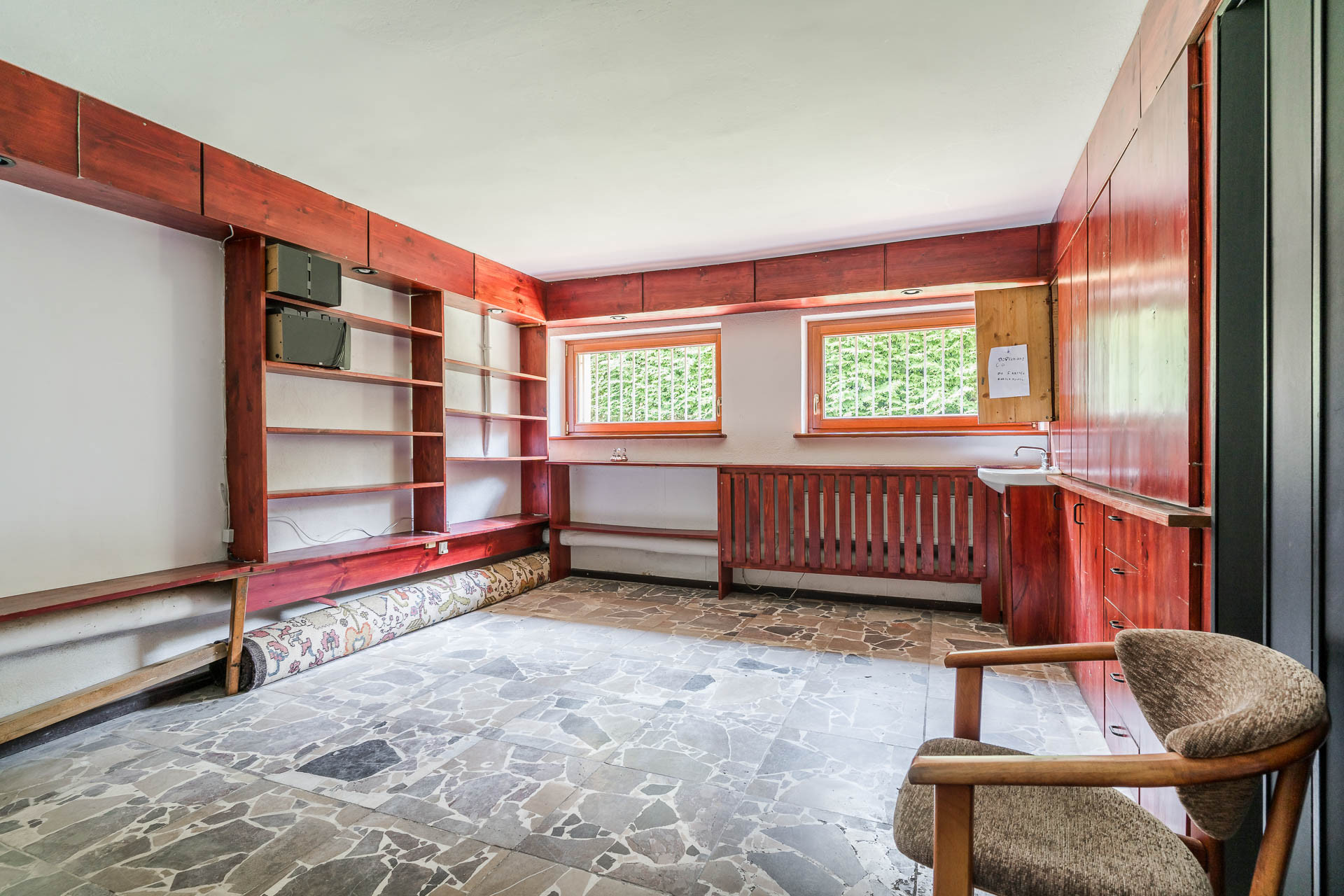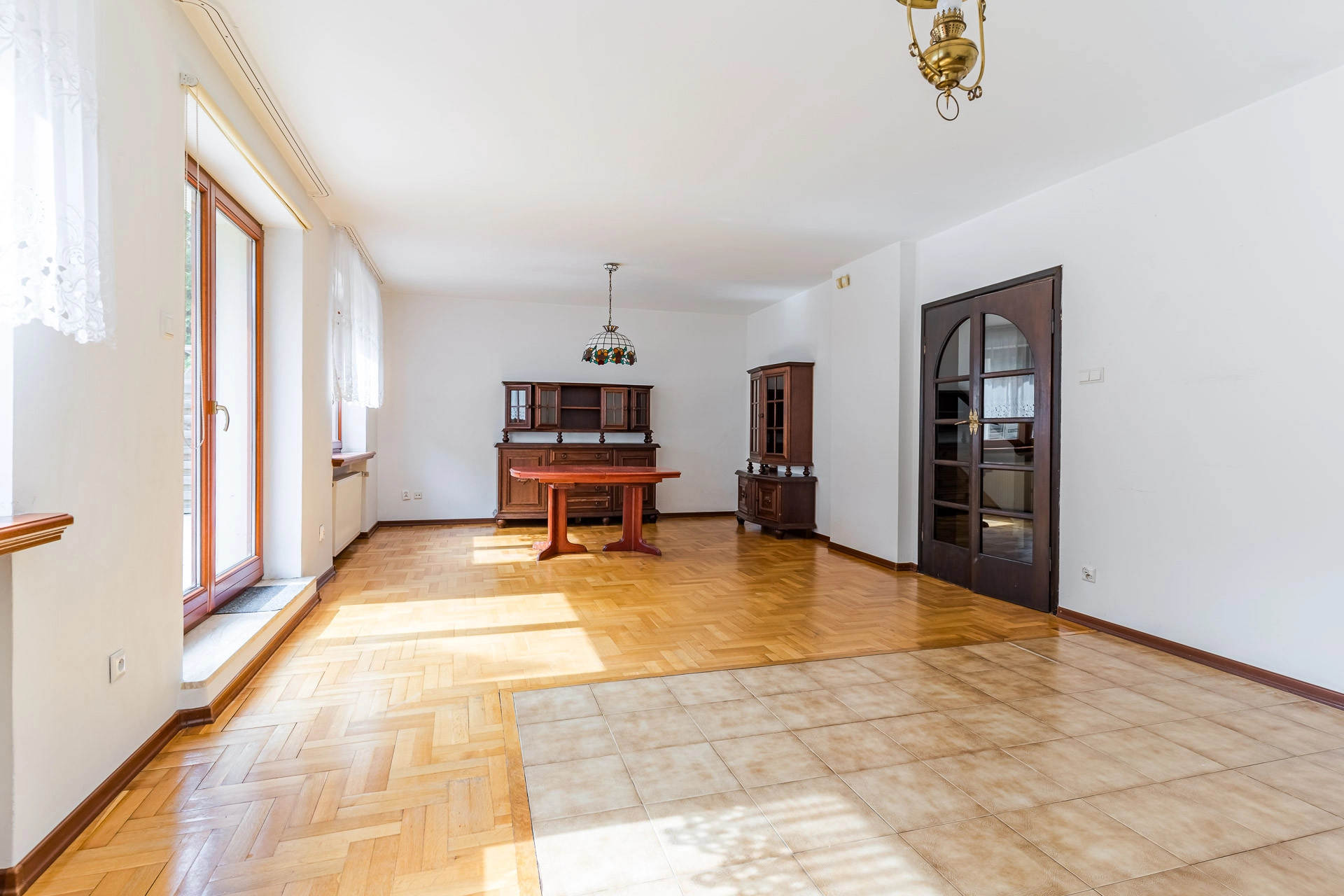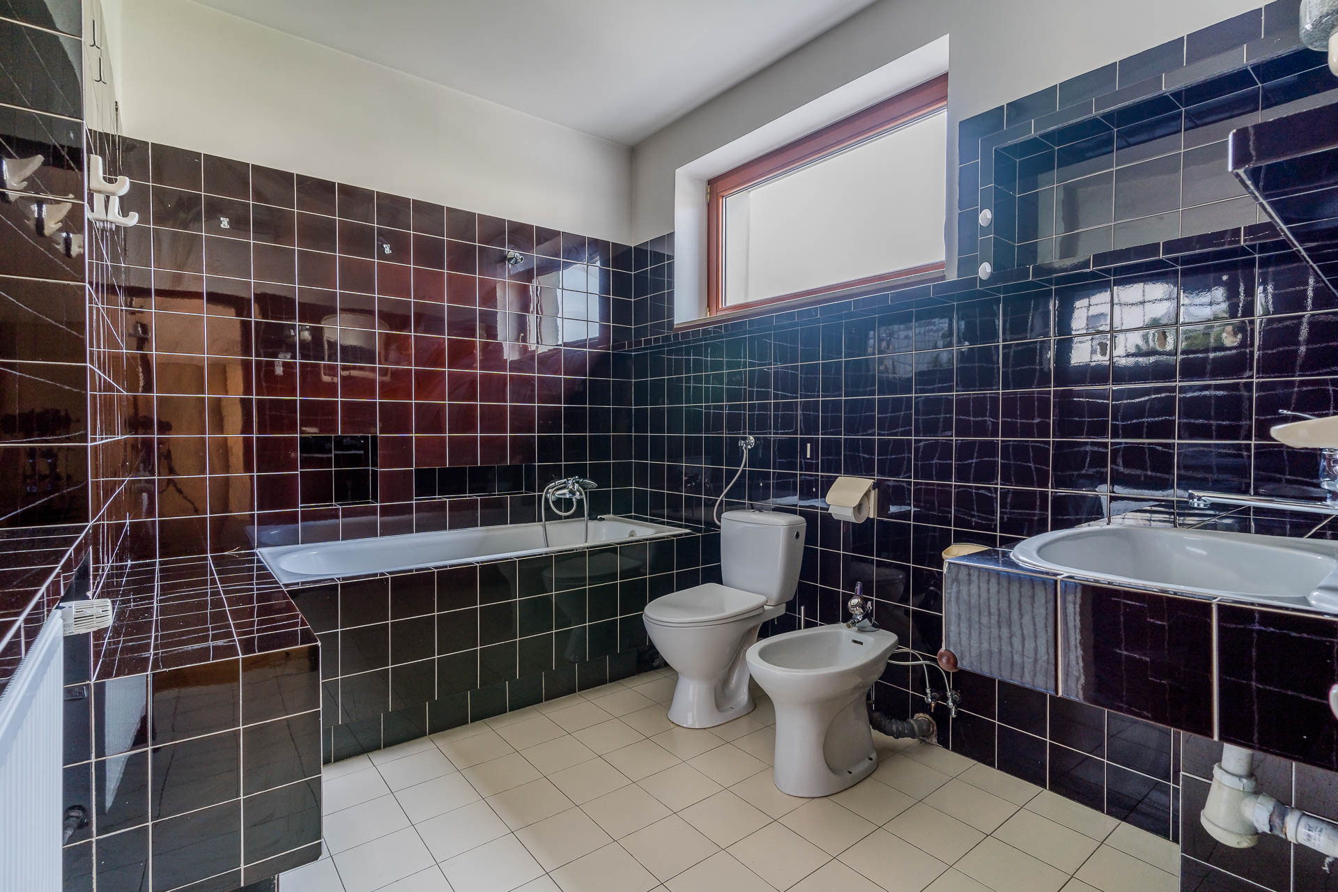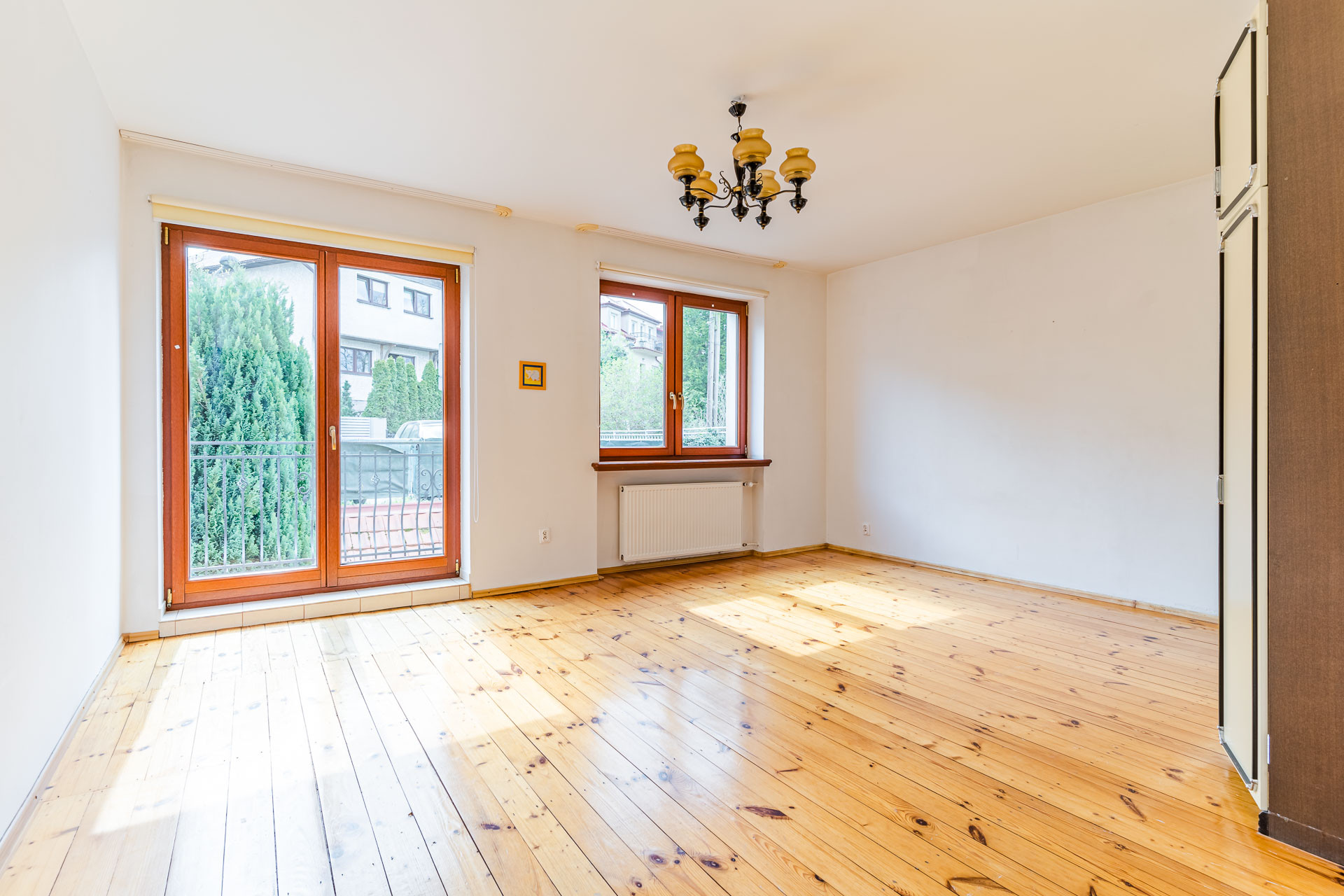 Na poziomie przyziemia mieści się „użytkowa” część nieruchomości i znajdziemy tu dwustanowiskowy garaż, pralnie oraz pomieszczenie z dwoma oknami, które z powodzeniem może zostać przeznaczone na gabinet.