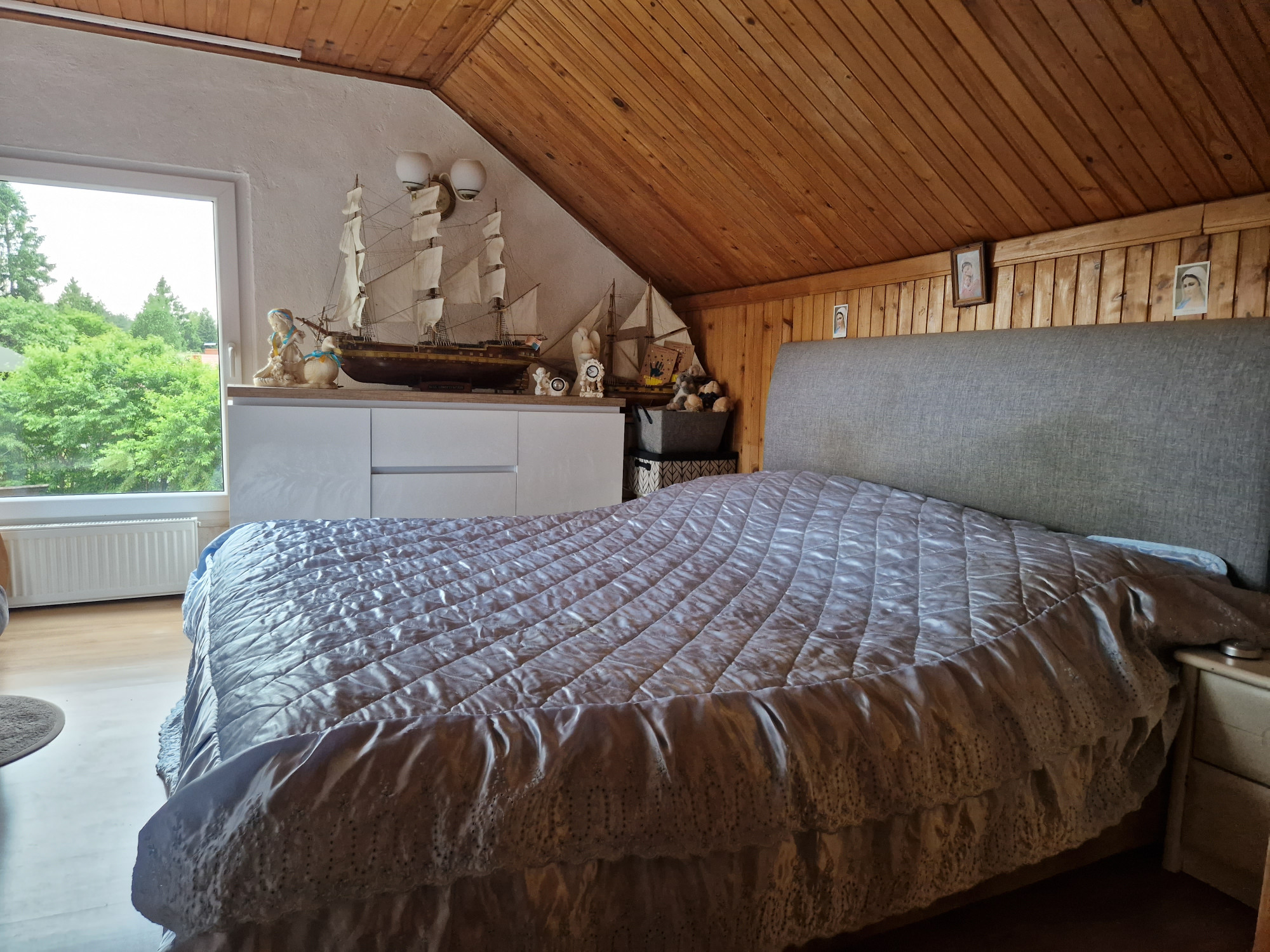 – słoneczna sypialnia z wyjściem na balkon z którego rozpościera się widok na ogród i staw